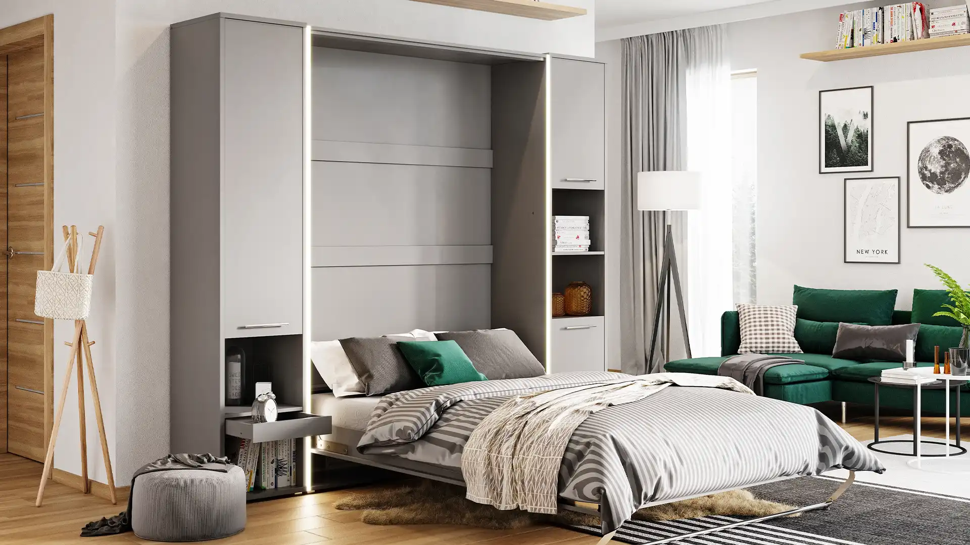 Jest jeszcze trzecie rozwiązanie, czyli nowoczesny półkotapczan, dzięki któremu możesz mieć wygodny salon z sypialnią w bloku, w domu i w każdym innym pomieszczeniu. Jak to działa? Bardzo prosto i lekko. Półkotapczan codziennie rano zamykasz, a odzyskaną przestrzeń możesz przeznaczyć na dowolne salonowe aktywności. Wieczorem półkotapczan ponownie otwierasz i w ciągu kilku sekund otrzymujesz komfortowe łóżko, już zaścielone i gotowe do spania. A samo spanie jest równie wygodne jak w klasycznym łóżku, ponieważ półkotapczan posiada szczebelkowy stelaż, na którym możesz umieścić dowolnie wybrany materac. A sama obsługa łóżka, czyli otwieranie i zamykanie, jest lekkie i bezproblemowe, dzięki pneumatycznym podnośnikom. Do tego miks rozmiarów (od 90 do 180 cm szerokości łóżka) i dwie wersje – wertykalna i horyzontalna – sprawiają, że znajdzie się model do każdego pomieszczenia, nawet do salonu z sypialnią na poddaszu. W ten sprytny sposób możesz urządzić salon z sypialnią, która znika w ciągu dnia. Zamiast niej jest salon z szafą, bo tak właśnie wygląda złożony półkotapczan.