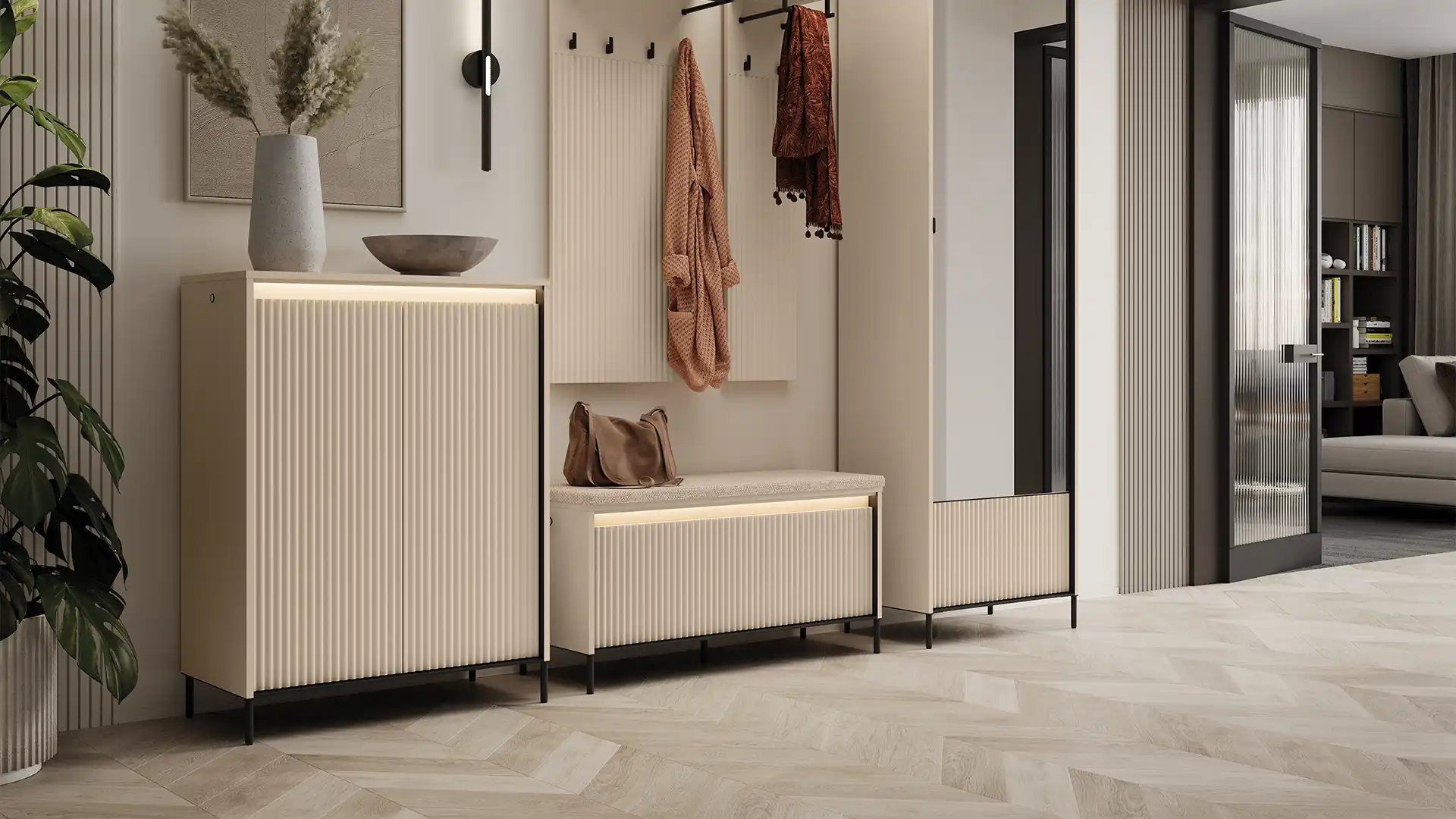 Na topie są dziś meble do przedpokoju o minimalistycznym designie – proste bryły, jasne kolory, dekory w naturalnych odcieniach drewna. Szczególnym zainteresowaniem cieszą się ryflowane fronty – to detal, który zmienia wszystko. Szafa do przedpokoju z ryflowanymi frontami wygląda nowocześnie, stylowo i nadaje wnętrzu wyjątkową elegancję. Meble do przedpokoju z frezami na frontach najczęściej dostępne są w odcieniach beżu, szarości, ale i klasycznej bieli. W końcu biała szafa to zawsze bezpieczny wybór, który pasuje do wielu aranżacji.