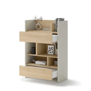 Do każdego łóżka można dokupić dodatkowe meble z funkcją przechowywania. Do pionowych pólkotapczanów dostępne są wysokie regały. W kolekcji znajdziesz dwa rodzaje regałów – oba wyposażone w zamykane szafki i otwarte półki, a jeden ponadto posiada niewielką szufladę. Z kolei do półkotapczanów poziomych można dokupić bardzo funkcjonalne nadstawki z drzwiami lub klapami. Wszystkie meble są dostępne w czterech popularnych kolorach – biały matowy, biały matowy/biały połysk, szary matowy i dąb artisan. Modne i ponadczasowe barwy dekorów, a także klasyczna forma i oszczędne wzornictwo zapewniają łatwą aranżację niemal w każdym pomieszczeniu i z różnymi meblami.