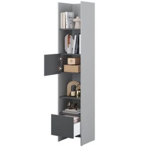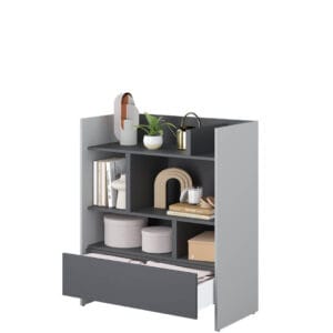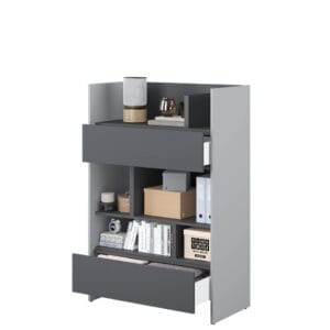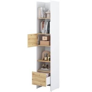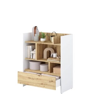 Do każdego łóżka można dokupić dodatkowe meble z funkcją przechowywania. Do pionowych pólkotapczanów dostępne są wysokie regały. W kolekcji znajdziesz dwa rodzaje regałów – oba wyposażone w zamykane szafki i otwarte półki, a jeden ponadto posiada niewielką szufladę. Z kolei do półkotapczanów poziomych można dokupić bardzo funkcjonalne nadstawki z drzwiami lub klapami. Wszystkie meble są dostępne w czterech popularnych kolorach – biały matowy, biały matowy/biały połysk, szary matowy i dąb artisan. Modne i ponadczasowe barwy dekorów, a także klasyczna forma i oszczędne wzornictwo zapewniają łatwą aranżację niemal w każdym pomieszczeniu i z różnymi meblami.