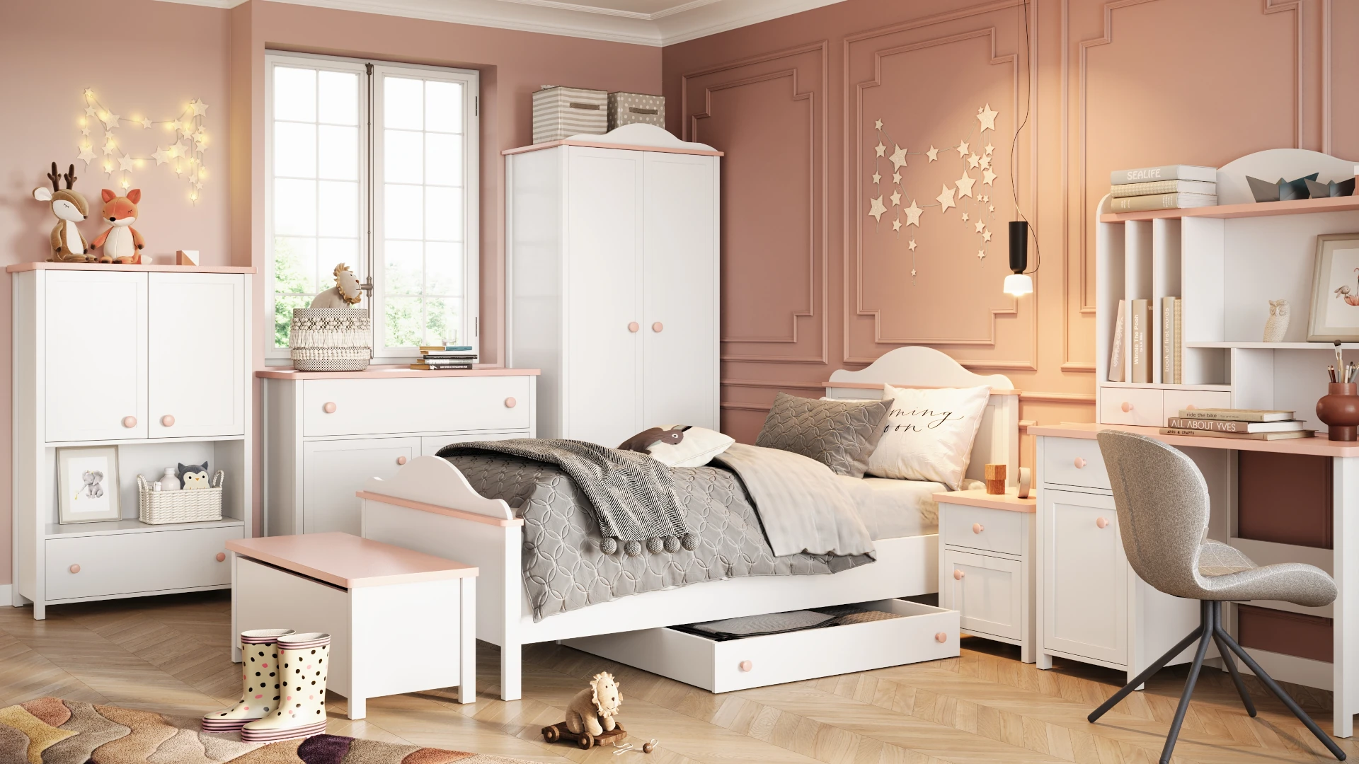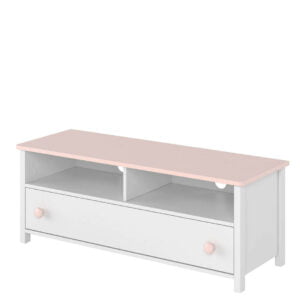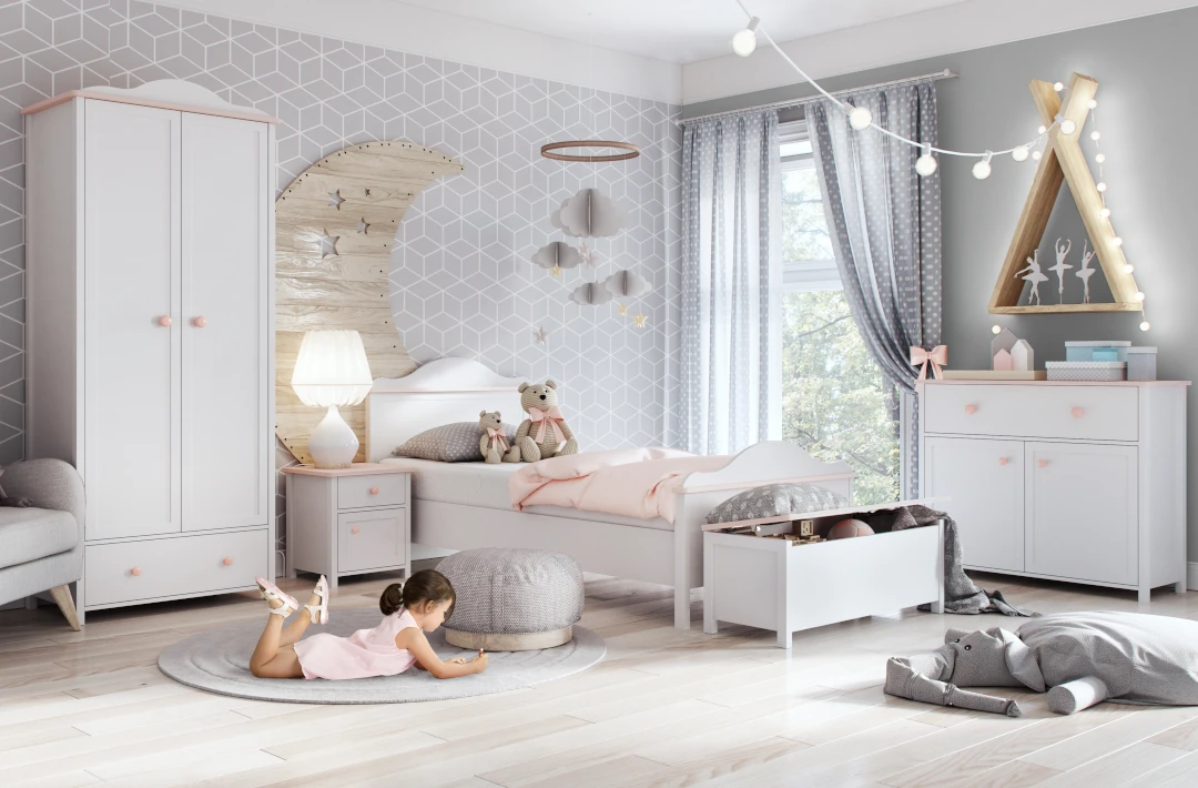 Ale dobre wzornictwo to nie wszystko, bo meble wyróżniają się też świetnie przemyślaną funkcjonalnością. Duża ilość brył pozwala wybrać te najbardziej pasujące do potrzeb dziecka oraz możliwości pokoju. Pojemne szafy, komody, regał i ciekawa skrzynia na zabawki oferują bardzo dużo miejsca do przechowywania. Co więcej, niemal każdy mebel wyposażono w pojemną i łatwo szufladę, umieszczoną na dole bryły. Dzięki temu dziecięce ręce mogą łatwo i szybko odnaleźć to czego właśnie szukają. Atutem jest wygodne łóżko dla dziewczynki z wysokim zagłówkiem. Na uwagę zasługują też praktyczne nadstawki, dzięki którym łatwo zamienisz zwykłe biurko czy komodę w romantyczną toaletkę lub sekretarzyk. W kolekcji znajdziesz nawet stolik kawowy, idealny dla dziewczynek, które często przyjmują gości oraz szafkę RTV dla wielbicielek gier multimedialnych.