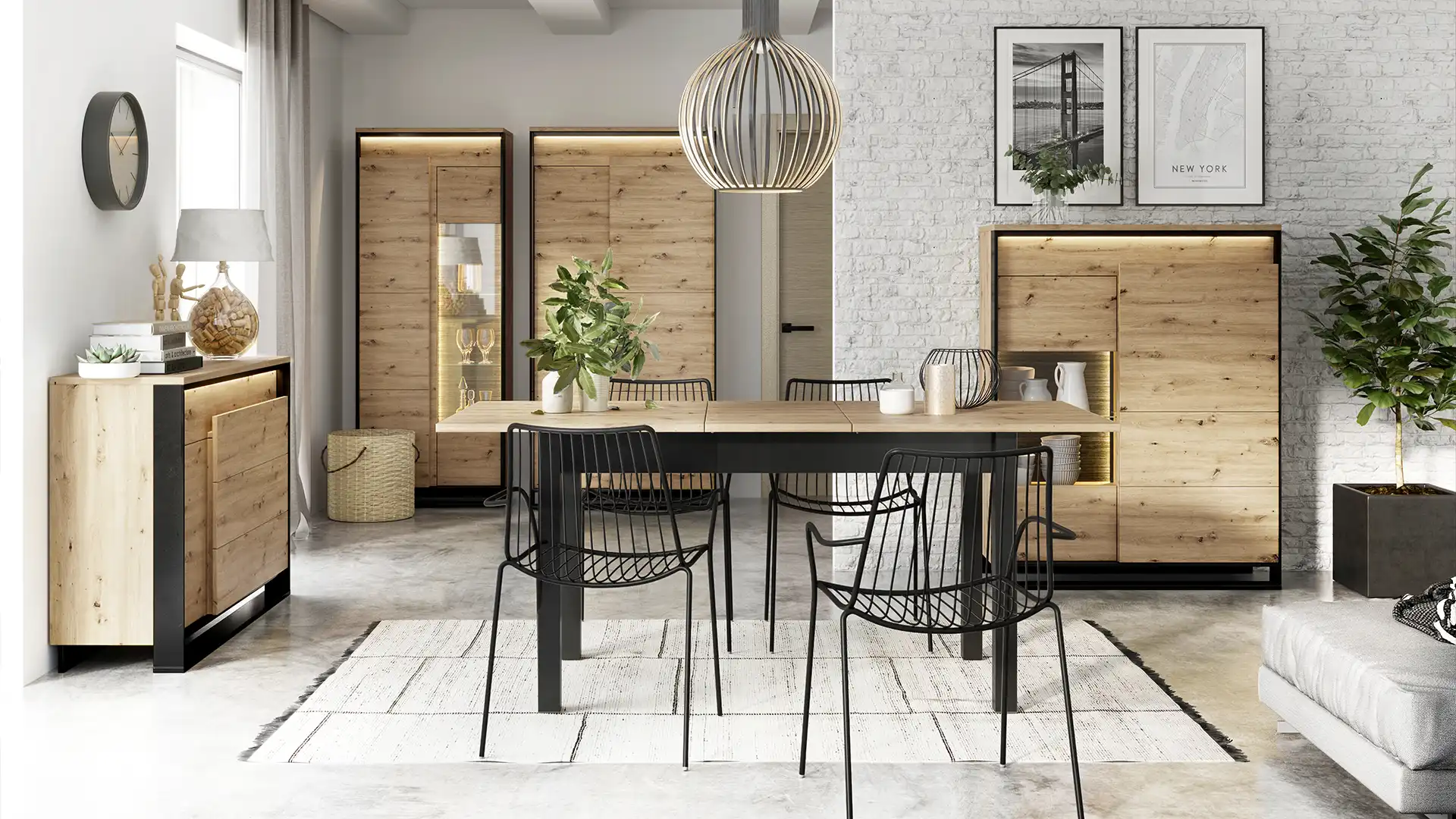 Przeszklone elementy, mają podobne właściwości jak jasne meble – optycznie powiększają i rozjaśniają wnętrze. Dotyczy to zarówno szkła w witrynach, jak i luster. Zgodnie z aktualnymi trendami, lustra w najróżniejszych rozmiarach można zawiesić w dowolnych częściach pokoju dziennego, również w okolicy stołu jadalnianego. Jeszcze lepiej szklane detale wyglądają w towarzystwie ledowego światła, które nadaje meblom głębię, a wieczorową porą wypełnia pomieszczenia przytulnym blaskiem.