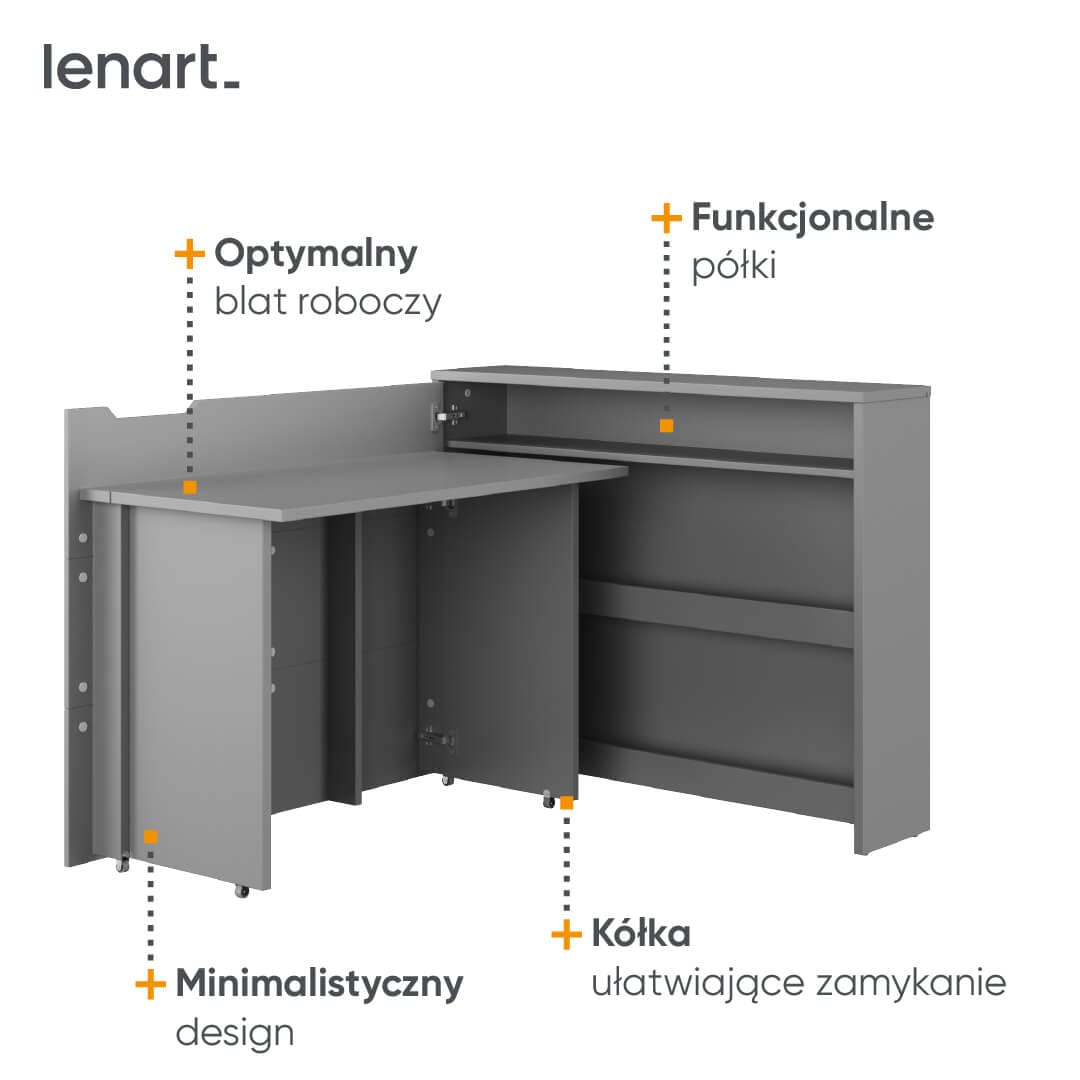 Praktyczne, rozsuwane biurko, które pozwala wygodnie gospodarować przestrzenią. Sprawdzi się w pokoju dziecka i nastolatka, gabinecie, biurze, małej kawalerce, wnętrzu zajmowanym przez singla czy seniora. Dzięki kółkom umieszczonym pod podstawami, biurko można łatwo i szybko zamknąć. Po złożeniu biurko wygląda jak zwykła komoda, a jej blat można wykorzystać do wyeksponowania dekoracji.