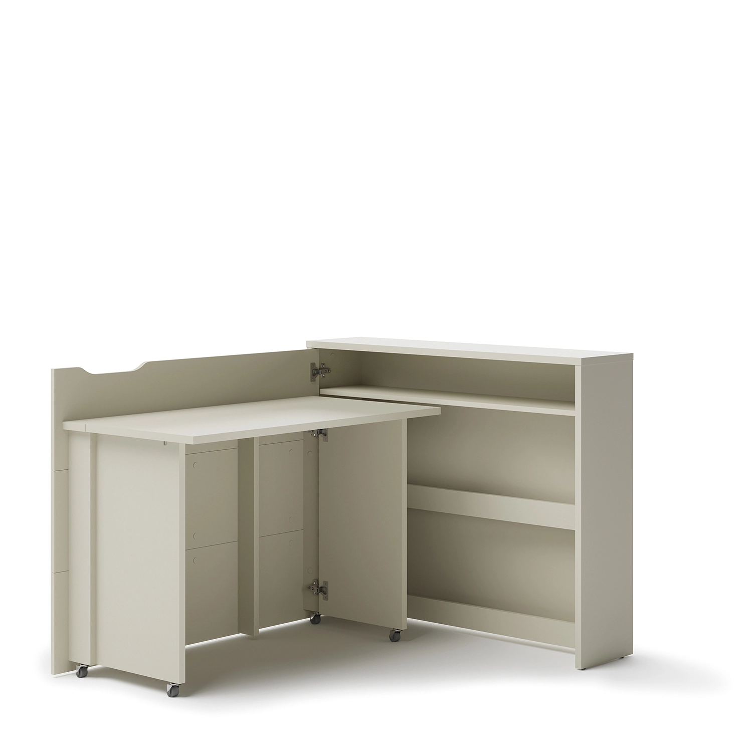 Praktyczne, rozsuwane biurko, które pozwala wygodnie gospodarować przestrzenią. Sprawdzi się w pokoju dziecka i nastolatka, gabinecie, biurze, małej kawalerce, wnętrzu zajmowanym przez singla czy seniora. Dzięki kółkom umieszczonym pod podstawami, biurko można łatwo i szybko zamknąć. Po złożeniu biurko wygląda jak zwykła komoda, a jej blat można wykorzystać do wyeksponowania dekoracji.