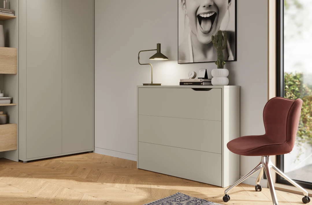 Minimalistyczny design i pięć wersji kolorystycznych (biały mat, biały połysk, szary, dąb artisan i kaszmir) pozwalają na łatwą aranżację z innymi meblami w mieszkaniu.