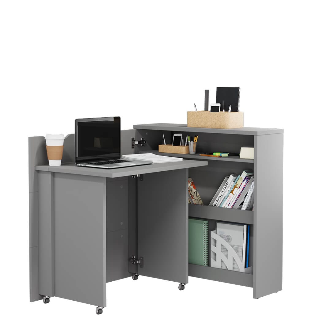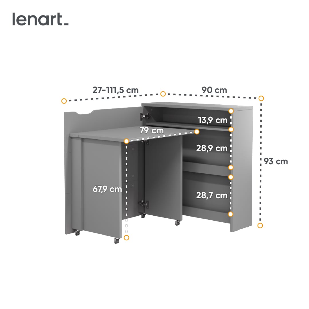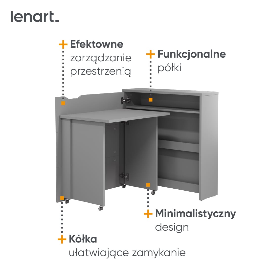 Małe składane biurko, które można łatwo zamknąć i sprawić, że wygląda jak subtelna komoda, to doskonałe rozwiązanie dla osób ceniących sobie funkcjonalność. Minimalistyczny design powoduje, że doskonale wpasowuje się w klasyczne, jak i nowoczesne wnętrza. Po otwarciu w swoim wnętrzu skrywa trzy półki do przechowywania dokumentów i akcesoriów biurowych. Komfort pracy i nauki zapewni natomiast ergonomicznej wielkości blat roboczy. Dostępne jest w czterech kolorach, w wersji prawo i lewostronnej oraz w dwóch rozmiarach!