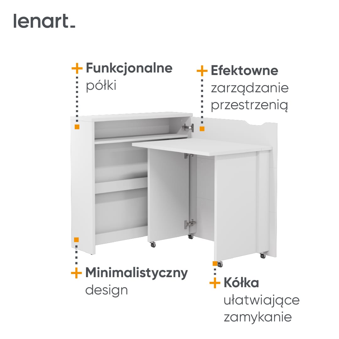 Małe składane biurko, które maksymalnie wykorzystuje potencjał dostępnej przestrzeni. Rozwiązanie, które świetnie sprawdzi się w kawalerkach, małych apartamentach oraz niewielkich mieszkaniach. Dzięki kółkom umieszczonym pod podstawami można je szybko i łatwo zamknąć. Dzięki temu od razu zapomnimy o obowiązkach związanych z nauką lub pracą. Po złożeniu zyskujemy minimalistyczną i smukłą komodę, na której możemy wyeksponować ramki ze zdjęciami, książki, pamiątki, rośliny lub ulubione dekoracje. Co ważne, wewnątrz skrywa aż trzy pojemne półki, które bez problemu pomieszczą artykuły biurowe oraz dokumenty.