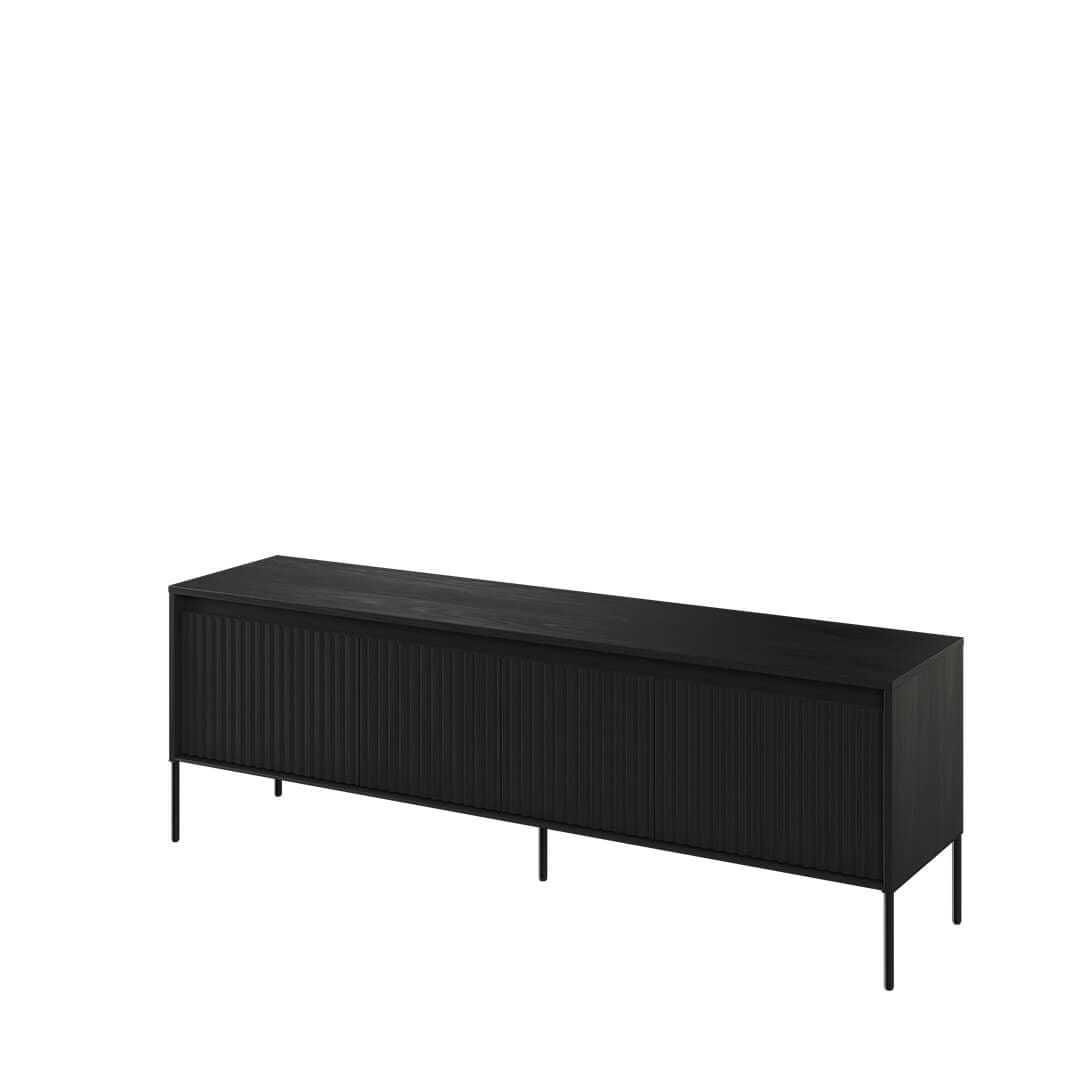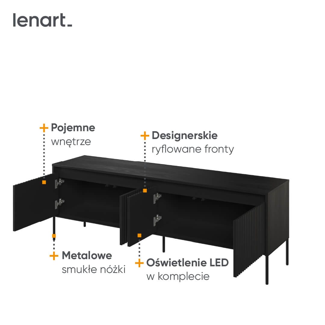 Dodatkowym atutem naszej czarnej szafki RTV jest jej ryflowany front. Ten designerski detal nadaje meblowi unikalnego charakteru i subtelnie go wyróżnia, podkreślając jednocześnie jego elegancję. Czarna szafka RTV nada Twojemu salonowi nowoczesności, stylu i elegancji, a dzięki subtelnemu oświetleniu ledowemu wprowadzi do wnętrza nastrojowy klimat.
