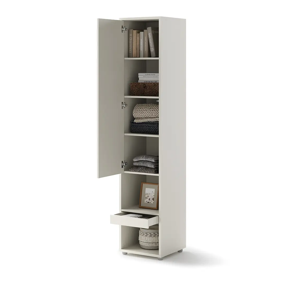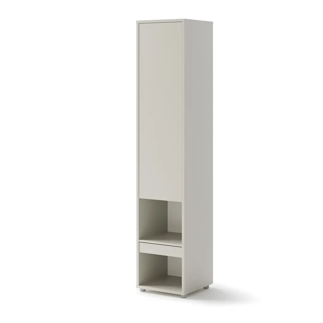 Dostawka do półkotapczanu pionowego to praktyczny i elegancki regał, który doskonale uzupełni Twoje wnętrze. Wysoki pionowy mebel wyposażony jest w drzwiczki, dwie otwarte wnęki oraz pojemną szufladę, co zapewnia optymalne wykorzystanie przestrzeni. To idealne miejsce na przechowywanie książek, dekoracji czy codziennych drobiazgów.