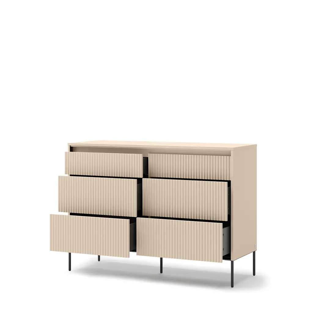 Co wyróżnia komodę 130 cm? Przede wszystkim ryflowane fronty, które nadają meblowi elegancki i subtelny wygląd. Te delikatne żłobienia dodają tekstury i głębi, dzięki czemu komoda staje się nie tylko funkcjonalnym, ale również dekoracyjnym elementem Twojej sypialni. Ryflowania wprowadzają do wnętrza nutę nowoczesności, jednocześnie zachowując prostotę, która pasuje do wielu stylów aranżacyjnych – od skandynawskiego, przez minimalistyczny, aż po klasyczny.