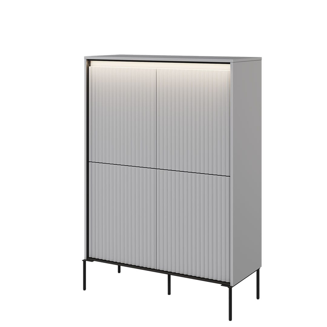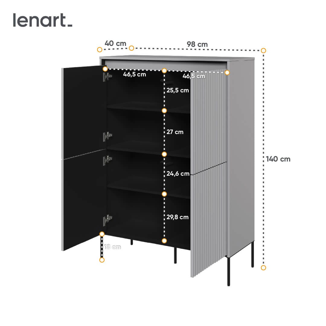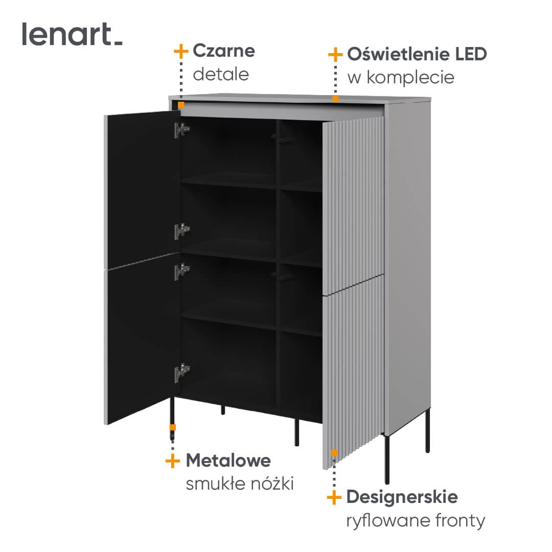 Dzięki swojemu uniwersalnemu designowi, nasza komoda o wysokości 140 cm doskonale wpasuje się w różne style wnętrzarskie. Bez względu na to, czy preferujesz nowoczesne i minimalistyczne aranżacje, czy też klasyczne i tradycyjne wnętrza, komoda stanie się eleganckim akcentem, który uzupełni wygląd Twojego salonu. Wybierając naszą komodę o wysokości 140 cm, otrzymujesz nie tylko praktyczne miejsce do przechowywania, ale również designerski element, który przyciągnie uwagę i stworzy przyjemną atmosferę w Twoim salonie. Jej ryflowane fronty dodają meblowi wyjątkowego uroku, a ledowe oświetlenie tworzy unikalną trójwymiarową kompozycję.