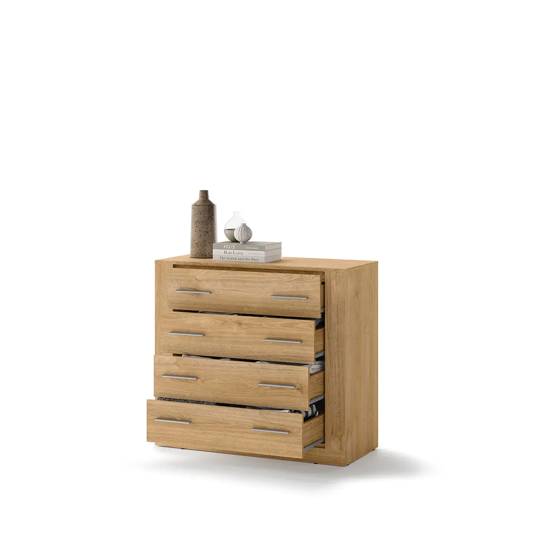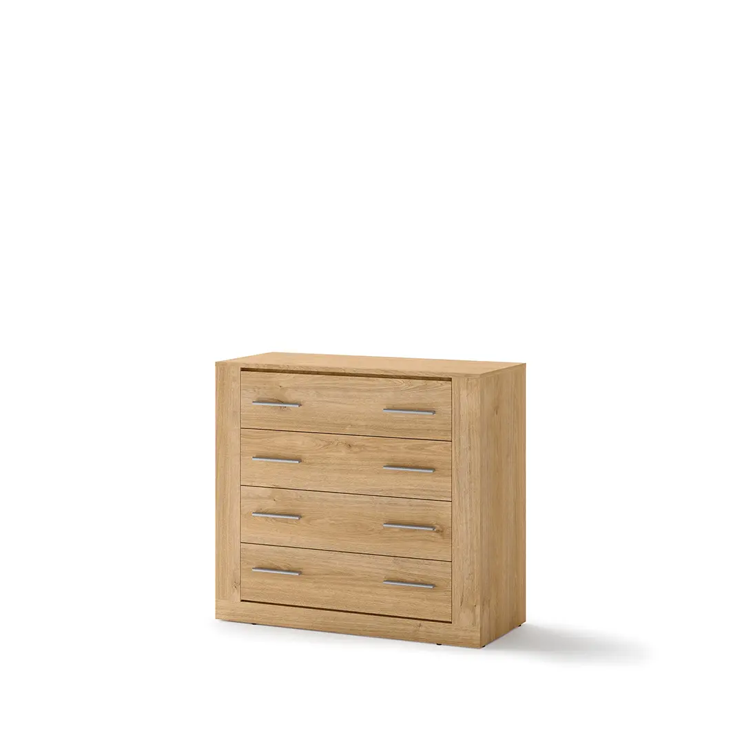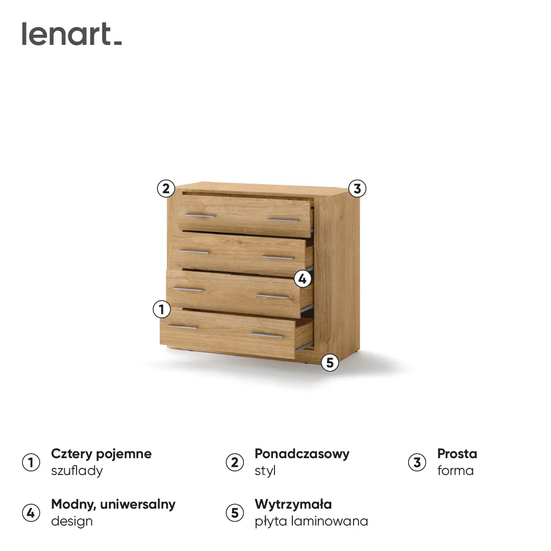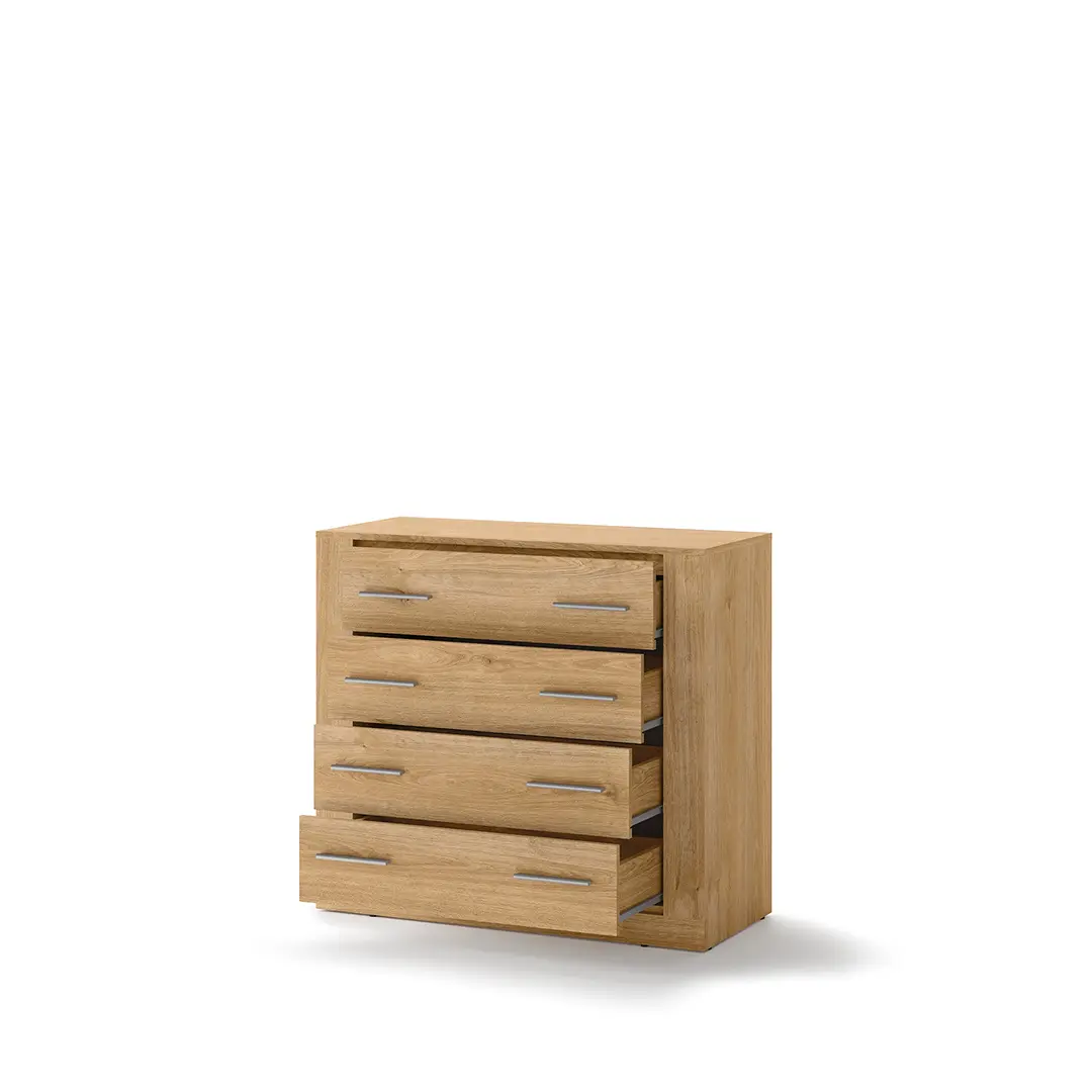 Komoda z czterema szufladami w uniwersalnym stylu, który pozwala elastycznie dopasować mebel do różnych stylów wykończenia wnętrza. W pojemnych szufladach wygodnie przechowasz bieliznę, dodatki, a także dokumenty.