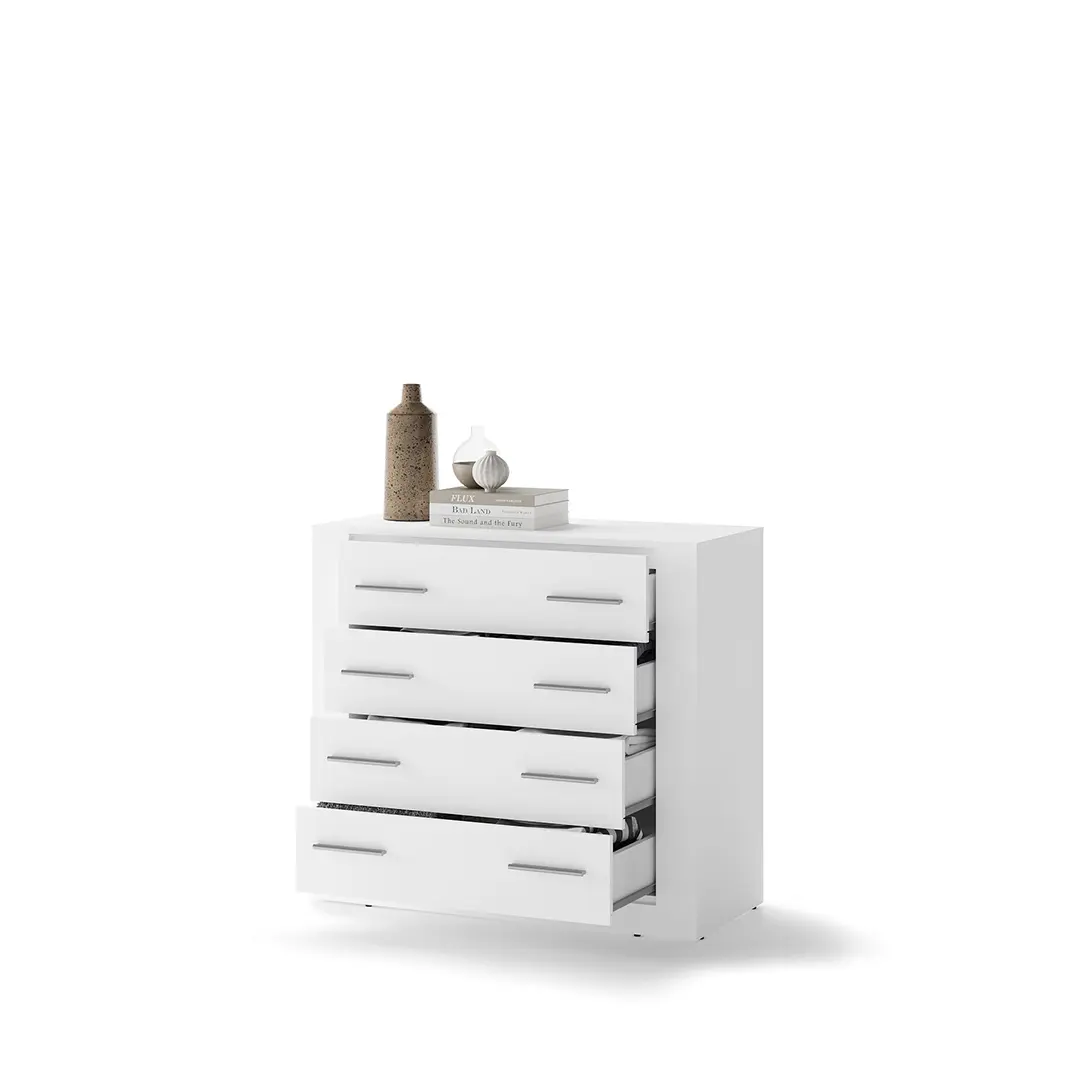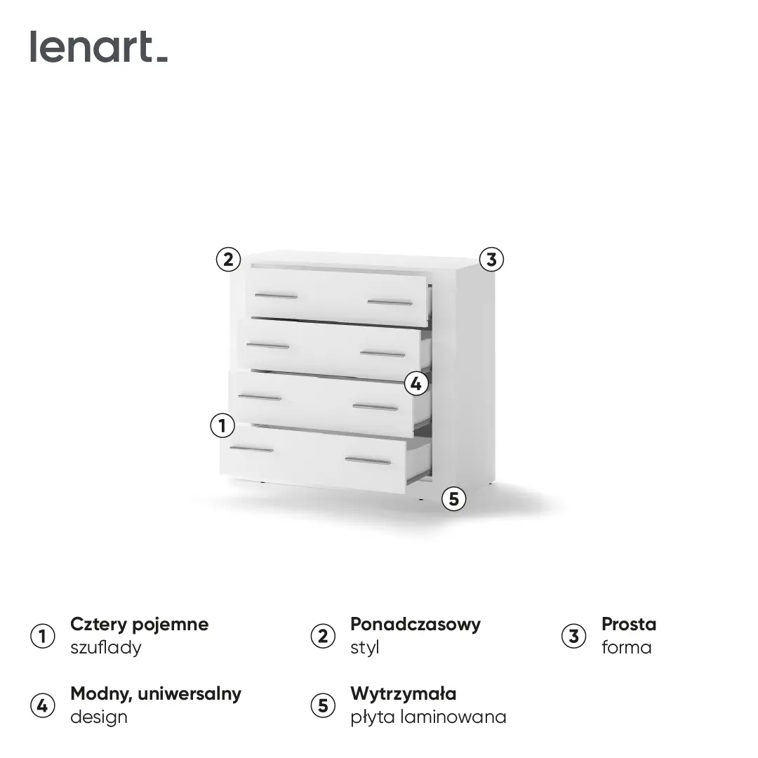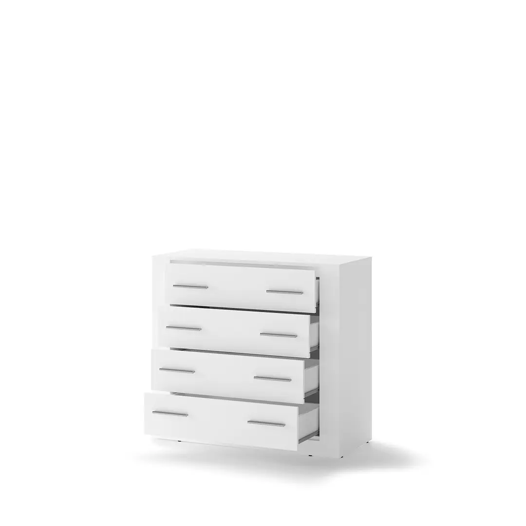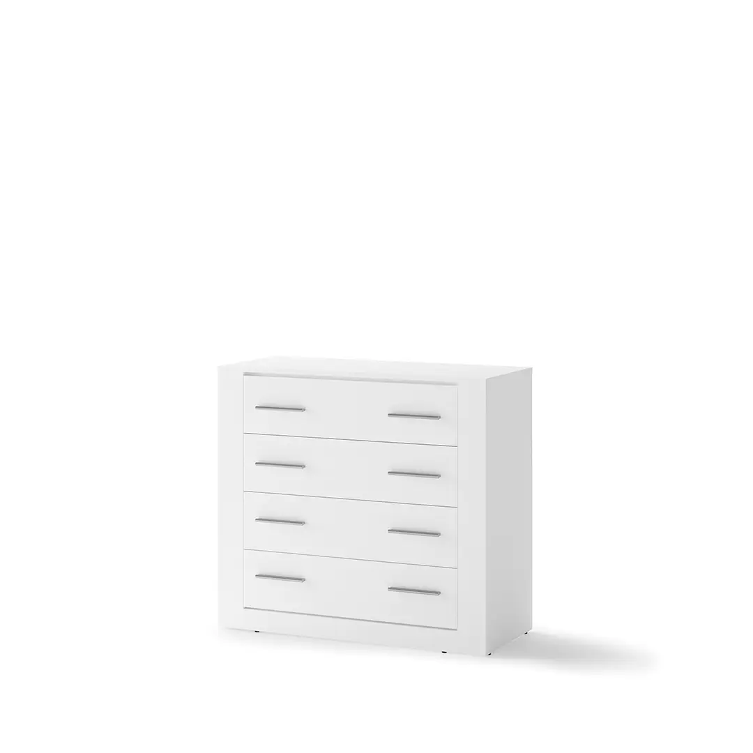 Komoda z czterema szufladami w uniwersalnym stylu, który pozwala elastycznie dopasować mebel do różnych stylów wykończenia wnętrza. W pojemnych szufladach wygodnie przechowasz bieliznę, dodatki, a także dokumenty.