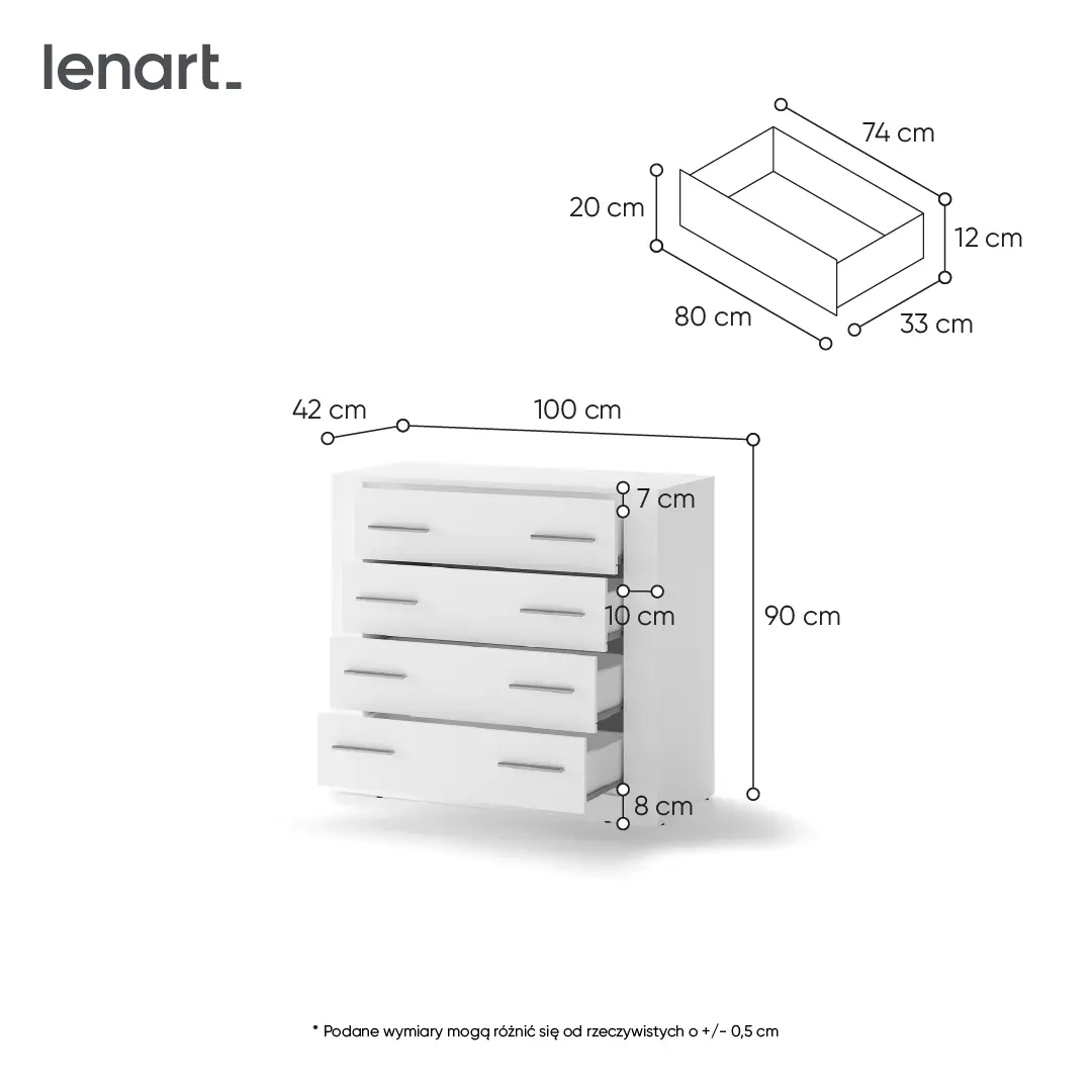 Komoda dostępna jest w kilku wersjach kolorystycznych. Mebel wykonano z wytrzymałej płyty laminowanej wykończonej trwałym obrzeżem ABS.