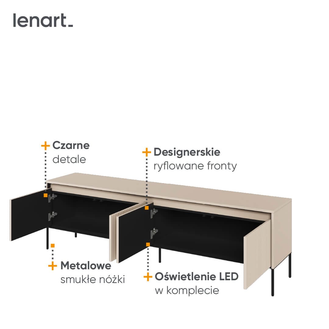 Komoda pod telewizor z ryflowanymi frontami jest wszechstronna i pasuje do różnych stylów aranżacyjnych. Bez względu na to, czy preferujesz nowoczesne wnętrza, industrialny styl czy klasyczną elegancję, nasza komoda będzie świetnym uzupełnieniem Twojej przestrzeni. Uzupełnij swoją przestrzeń tym imponującym meblem, który nie tylko spełni Twoje potrzeby przechowywania, ale również stanie się centralnym punktem w Twoim pomieszczeniu. Bądź w trendzie i ciesz się funkcjonalnością dzięki naszej komodzie pod telewizor z ryflowanymi frontami!
