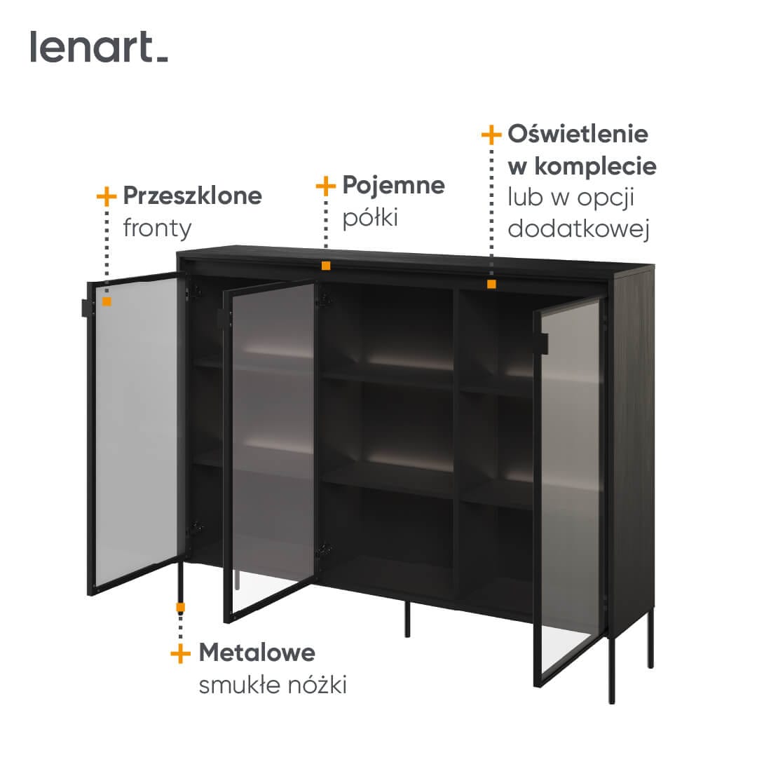 Komoda przeszklona to nie tylko praktyczny mebel, ale również designerska ozdoba Twojego wnętrza. Jej nowoczesny i elegancki design doskonale wpisuje się w różne style aranżacyjne, od nowoczesnego po klasyczny. Bez względu na to, czy jest to salon, jadalnia, czy sypialnia, przeszklona komoda stanie się centralnym punktem i dodatkowym akcentem we wnętrzu. Komoda przeszklona TR-08 została zaprojektowana w aż pięciu wersjach kolorystycznych, a ponadto posiada klimatyczne oświetlenie w komplecie w postaci paska led pod górnym blatem. Opcjonalnie można również doposażyć ją w oświetlenie umiejscowione za półkami wewnętrznymi.