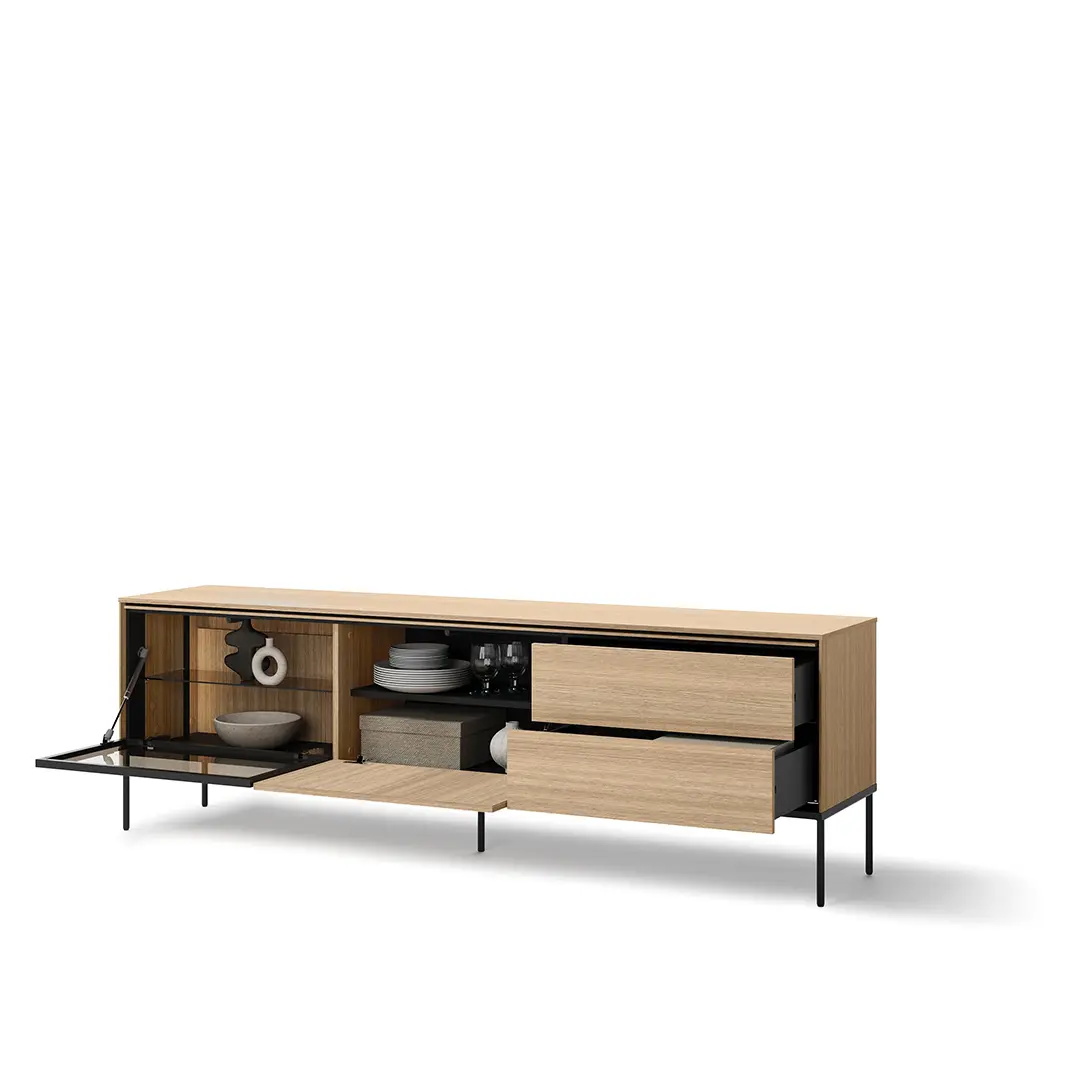 Nasza komoda RTV dąb została zaprojektowana z myślą o wygodzie użytkowania. Wyposażona w pojemne półki i szuflady, oferuje mnóstwo miejsca na przechowywanie sprzętu multimedialnego, akcesoriów oraz innych przedmiotów codziennego użytku. Dodatkowo, odpowiednie rozplanowanie przestrzeni ułatwia organizację kabli, co pozwala utrzymać porządek i estetyczny wygląd wnętrza.