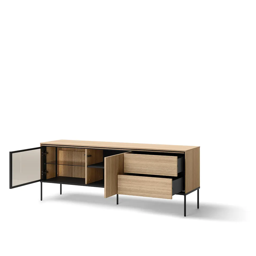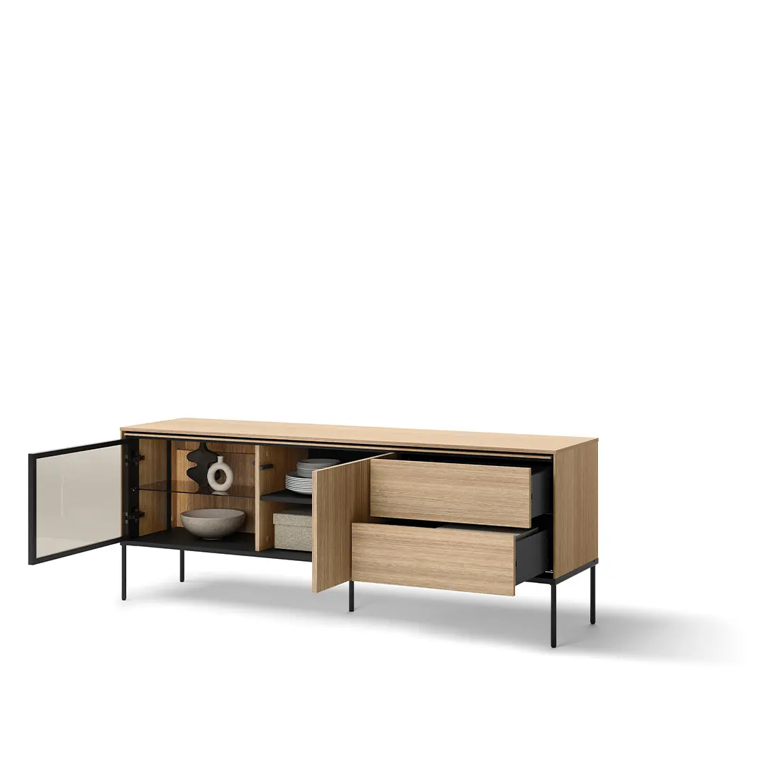 Komoda RTV została zaprojektowana z myślą o Twojej wygodzie. Posiada przestronne półki i szuflady, które pomieszczą cały sprzęt multimedialny – telewizor, odtwarzacz, konsole, a także kable, piloty i inne akcesoria. Dzięki temu wszystkie elementy Twojego centrum rozrywki będą zawsze na swoim miejscu, a Ty będziesz mógł cieszyć się porządkiem i łatwym dostępem do wszystkiego, czego potrzebujesz.