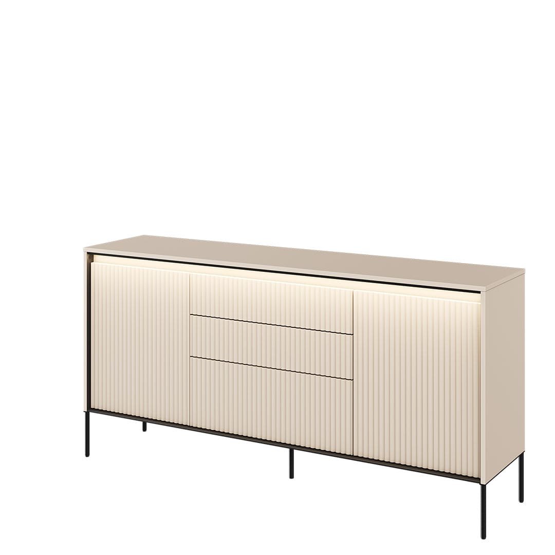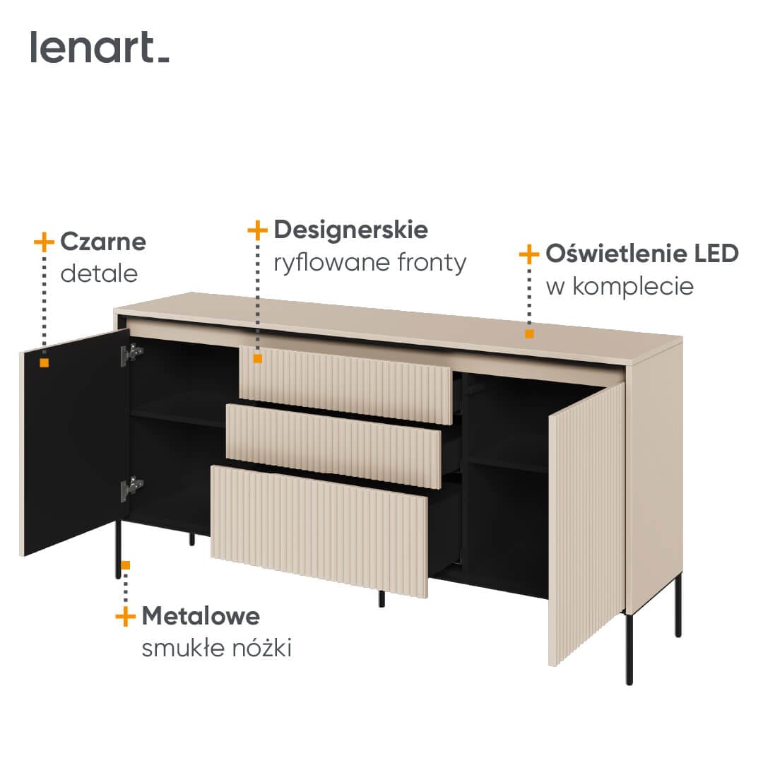 Jeśli poszukujesz komody, która połączy funkcjonalność z wyjątkowym designem, to mamy dla Ciebie idealne rozwiązanie! Nasza komoda ryflowana z szufladami to mebel, który nie tylko spełni Twoje potrzeby przechowywania, ale także będzie przyciągał uwagę swoim unikalnym stylem. Jednym z elementów, który przyciąga wzrok jest eleganckie ryflowanie frontów, które podkreśla ledowe oświetlenie. Ten unikalny wzór dodaje meblowi wyjątkowego charakteru, nadając mu atrakcyjny i oryginalny wygląd. To idealne rozwiązanie, jeśli chcesz wnieść do swojego wnętrza element stylowy, który jednocześnie pełni praktyczną funkcję. Nasza komoda ryflowana z szufladami została wykonana z wysokiej jakości materiałów, co zapewnia jej trwałość i wytrzymałość na długie lata użytkowania. Komoda ta oferuje również wiele praktycznych rozwiązań. Szuflady są idealne do przechowywania różnych przedmiotów, takich jak ubrania, bielizna czy akcesoria. Dzięki nim wszystko będzie dobrze zorganizowane i łatwo dostępne. Dodatkowo, szeroki blat komody może służyć jako miejsce do eksponowania ozdób czy innych dekoracji, dodając jeszcze więcej uroku Twojemu wnętrzu. Jeżeli szukasz komody ryflowanej z szufladami, która połączy styl z praktycznością, to kolekcja TREND jest właśnie dla Ciebie!