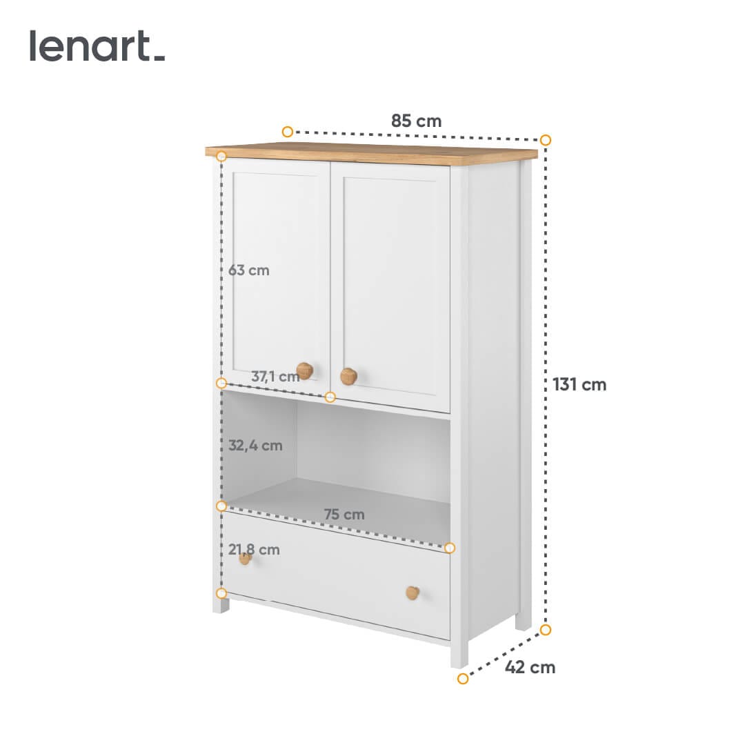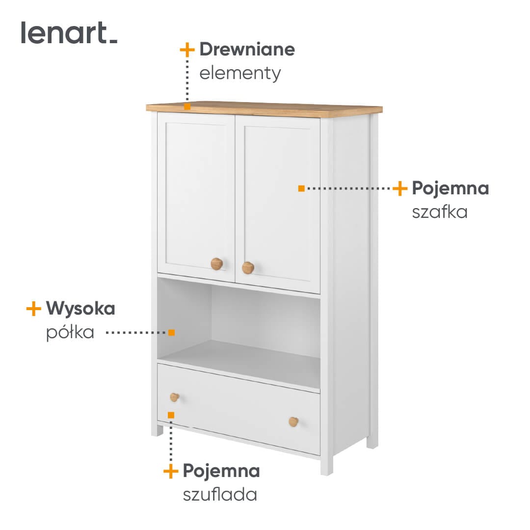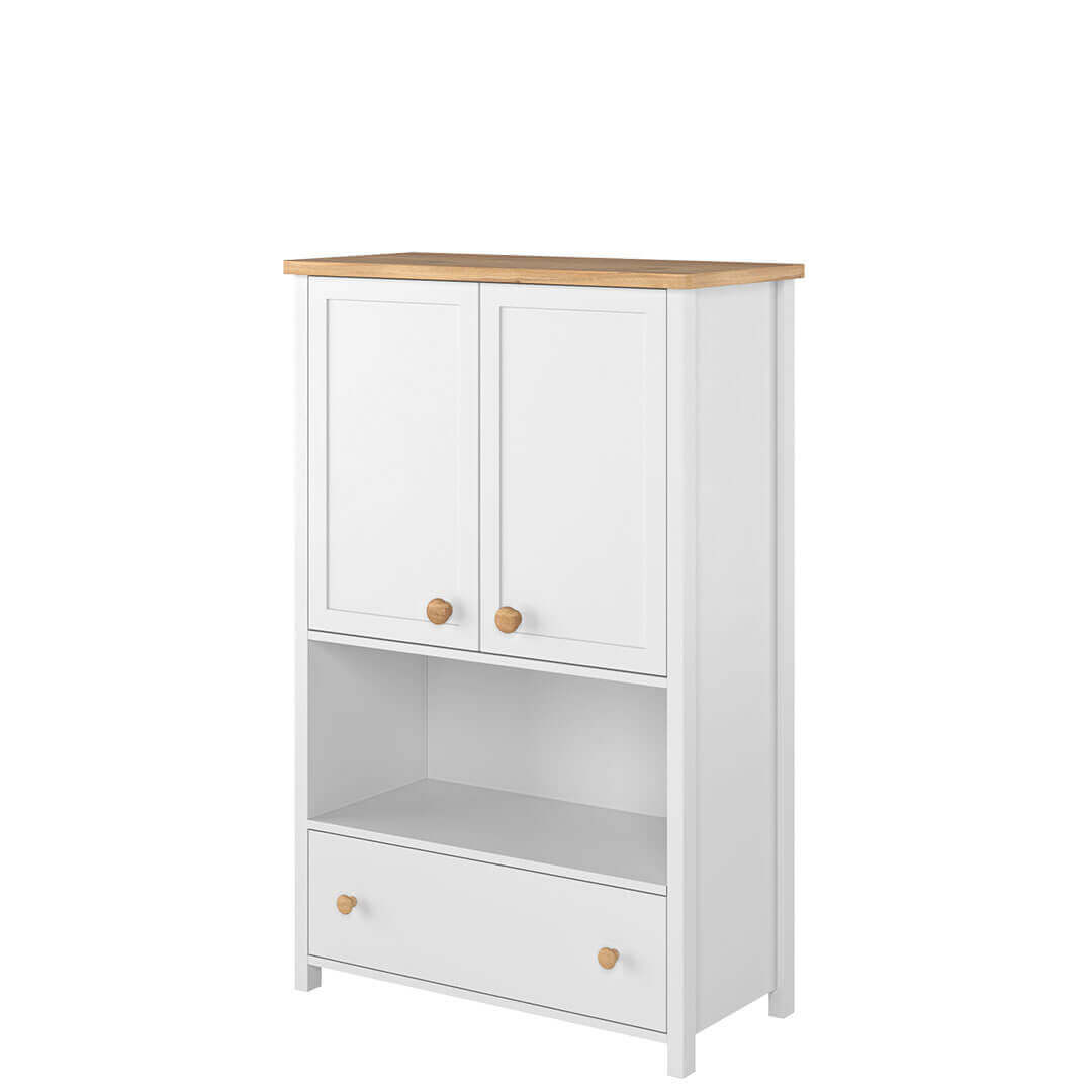 Stylowa, wysoka komoda z dwojgiem drzwi, półką na książki lub dekoracje oraz pojemną i łatwo dostępną szufladą na bieliznę lub drobiazgi.