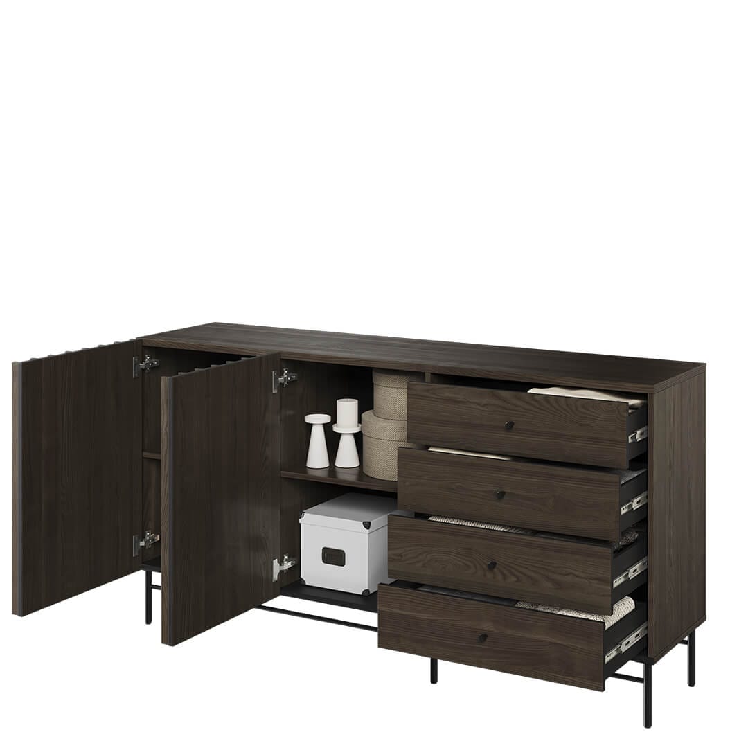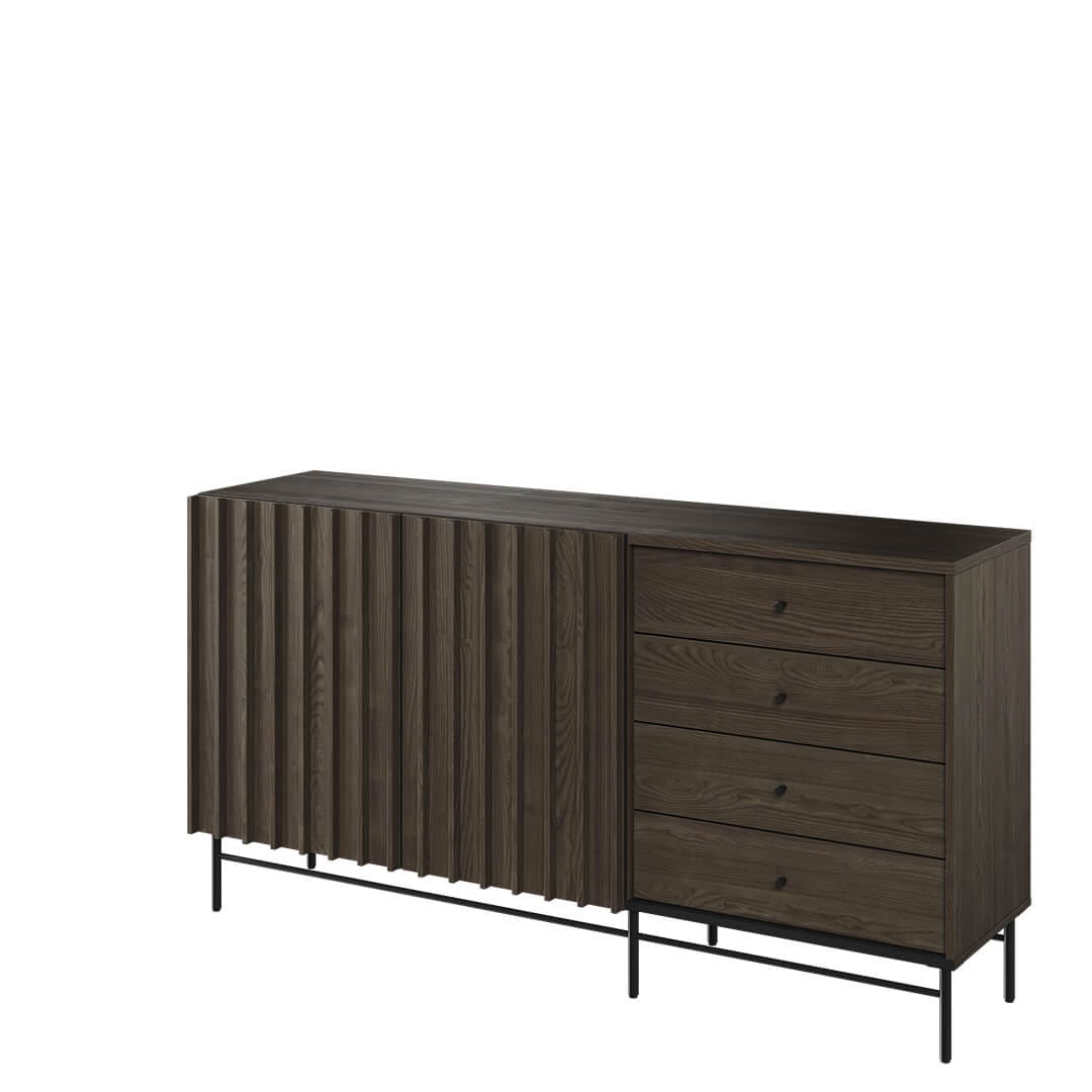 Komoda z 4 szufladami to jeden z najpopularniejszych mebli na rynku. Dlaczego? Ponieważ oferuje wiele korzyści, które sprawiają, że warto zainwestować w ten mebel. Po pierwsze, komoda ta oferuje dużo miejsca do przechowywania. W czterech szufladach można zmieścić wiele ubrań, książek, dokumentów lub innych rzeczy, co pomaga w utrzymaniu porządku w domu. Po drugie, komoda ta jest bardzo łatwa w utrzymaniu czystości. Dzięki swojej prostocie i eleganckiemu wyglądowi z pewnością doda uroku Twojemu wnętrzu. Ta z kolekcji PIEMONTE jest dwudrzwiowa i łączy w sobie oryginalne zestawienie koloru jesion Portland z metalowymi czarnymi dekorami. Smukłe lamele będą dodatkowym atutem dla osób podążających za trendami!