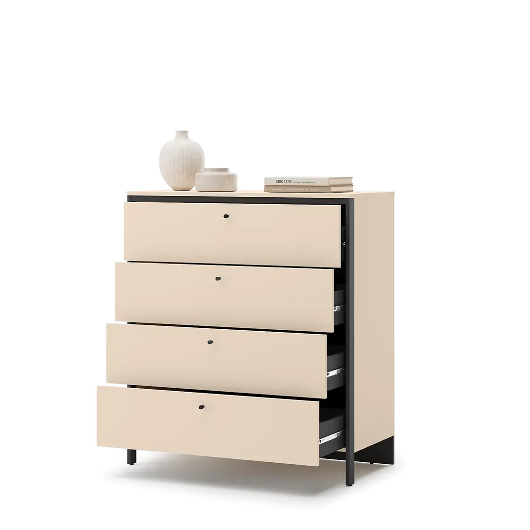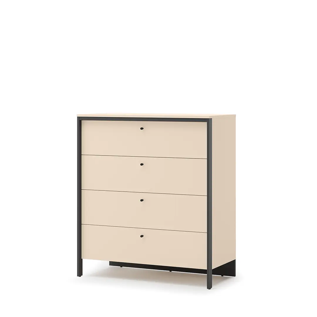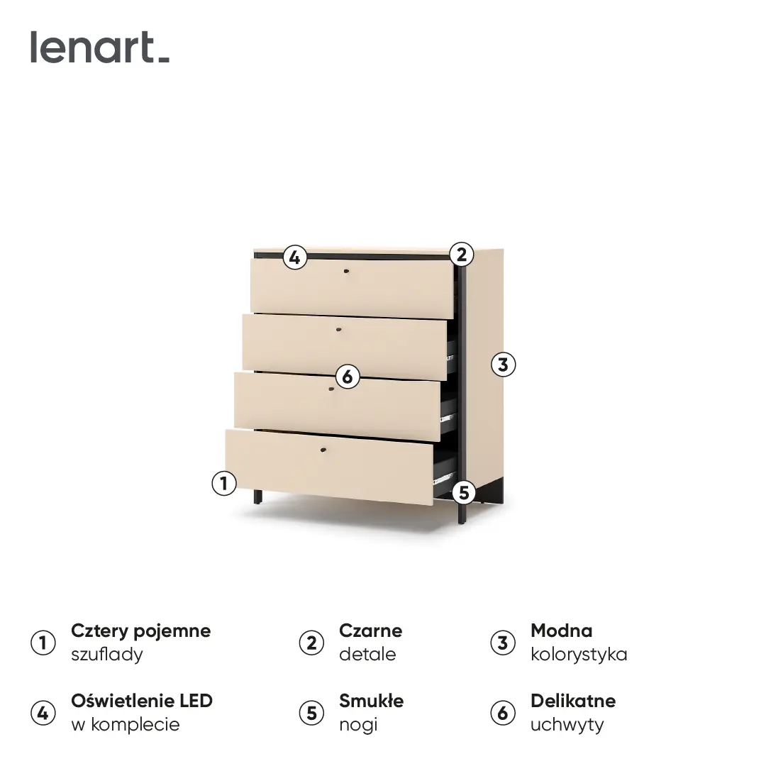 Komoda z czterema pojemnymi szufladami, stanowiąca element kolekcji ENNA. Zaprojektowana jako część wyposażenia sypialni. Zapewnia dodatkowe miejsce do przechowywaniu ubrań i akcesoriów. Atutem produktu jest podświetlenie LED.