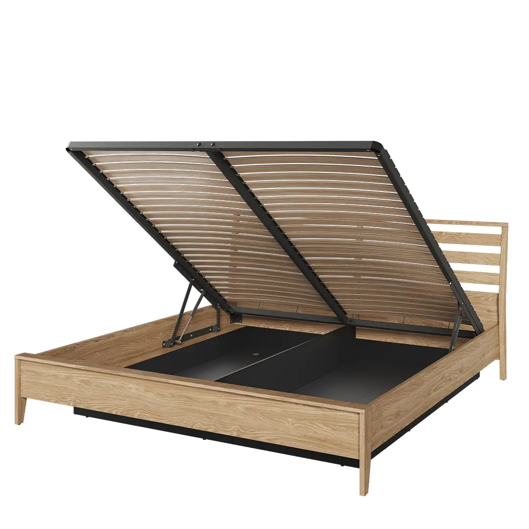 Łóżko przystosowane jest do materacy o wymiarach 180 x 200 cm. Jest więc odpowiednie zarówno dla par, jak i dla osób, które cenią sobie większą przestrzeń podczas snu. Zastosowany w konstrukcji stelaż jest bardzo stabilny. Przekłada się to na zwiększenie komfortu podczas nocnego odpoczynku. Rama łóżka ma charakterystyczny odcień dębu olejowanego, który dodaje pomieszczeniu przytulnego charakteru.