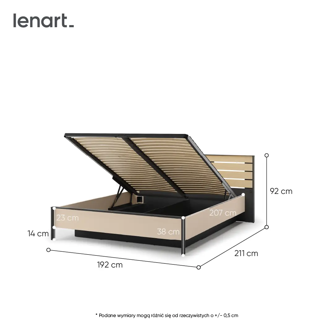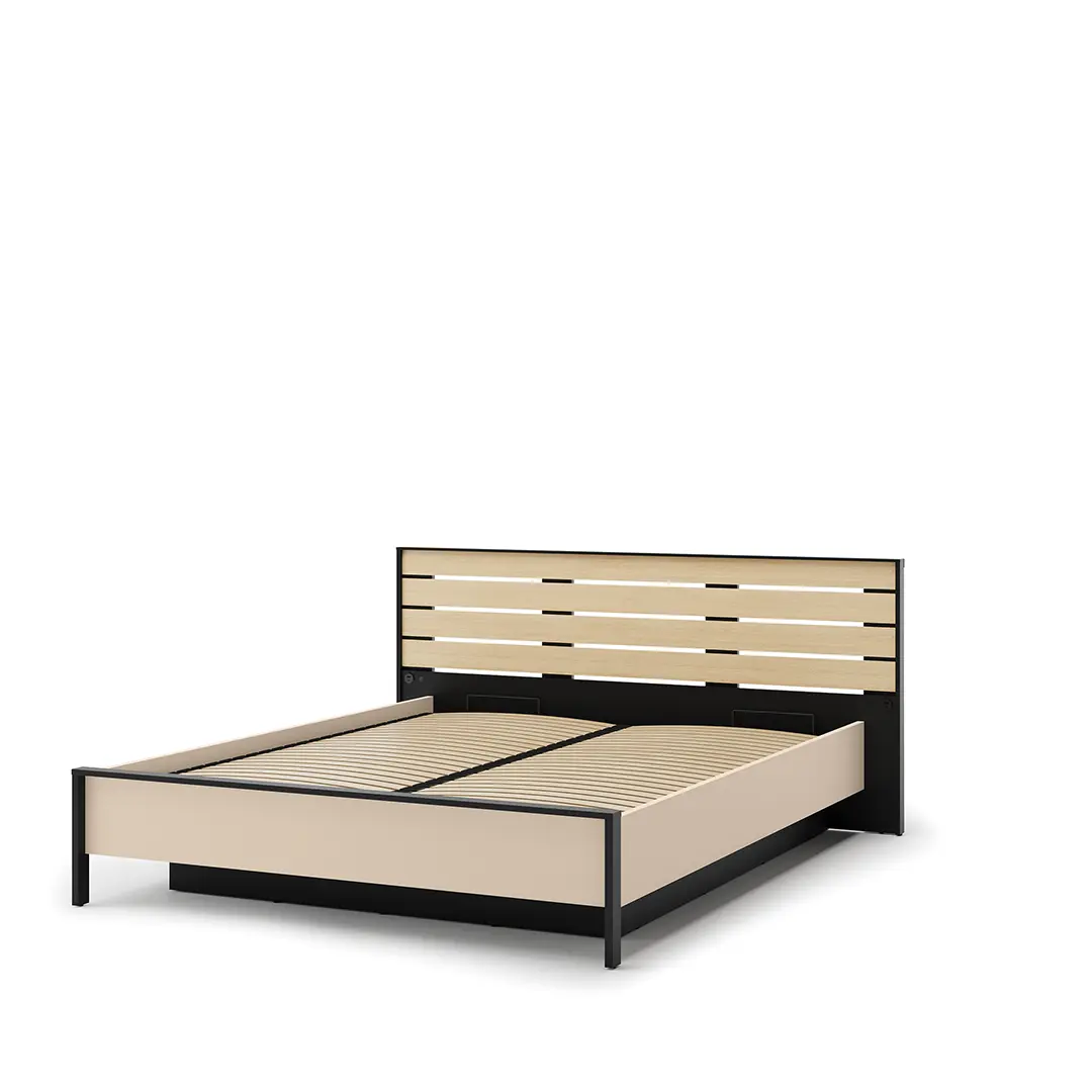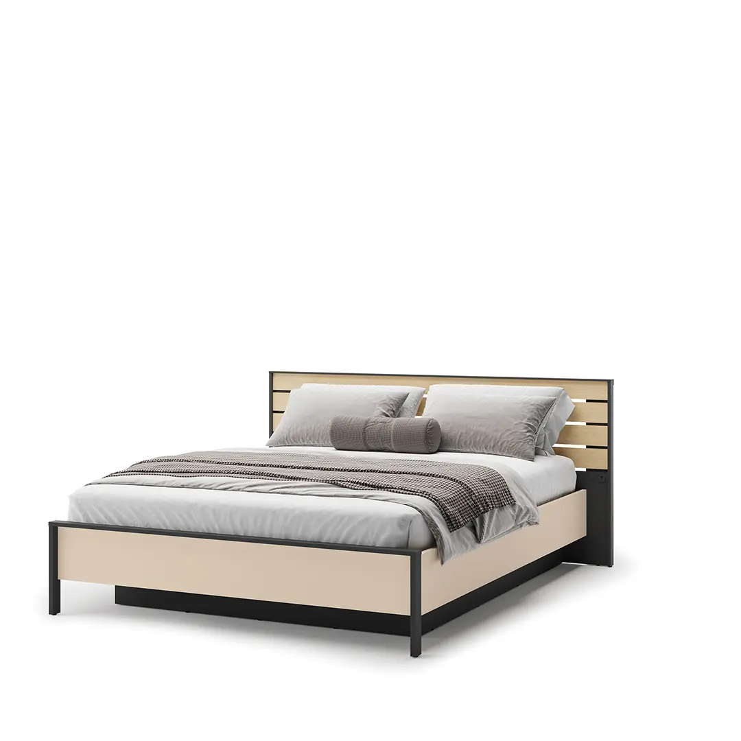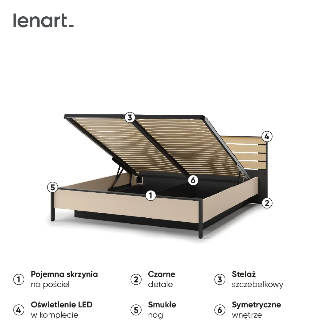 Łóżko do sypialni nowoczesne, przeznaczone do materaca o szerokości 160 cm. Wyposażone w stelaż szczebelkowy, zapewniający odpowiednie podparcie materaca oraz jego prawidłowe ułożenie. Dodatkową funkcjonalność stanowi klimatyczne oświetlenie LED.