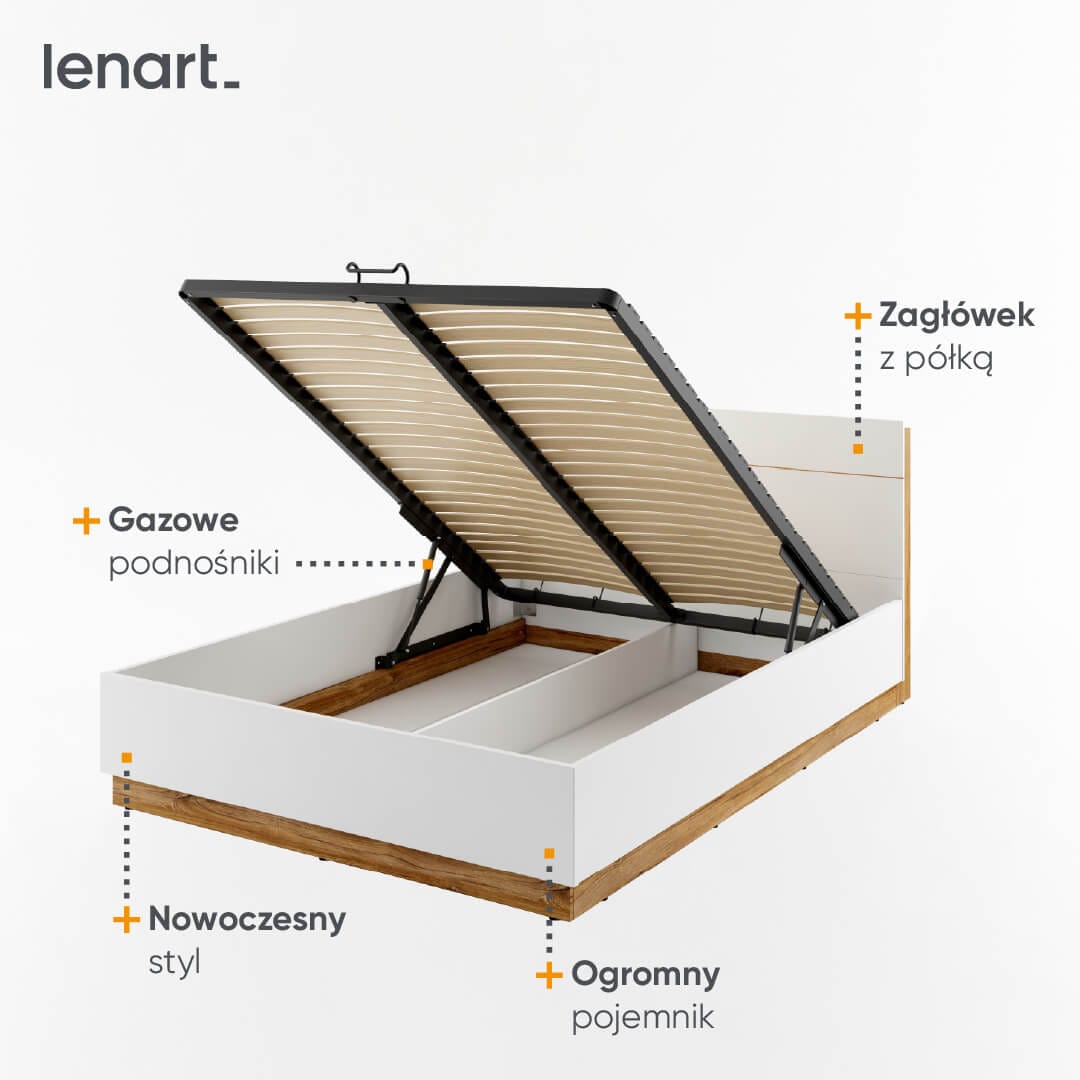 Wewnątrz łóżka zaprojektowano ogromny pojemnik – można w nim schować nie tylko pościel, ale także wszystko, co nie zmieściło się w szafie – walizki podróżne, sezonową odzież, akcesoria sportowe. Zastosowanie specjalnego mechanizmu z gazowymi podnośnikami sprawia, że podniesienie ramy jest lekkie i bezproblemowe.