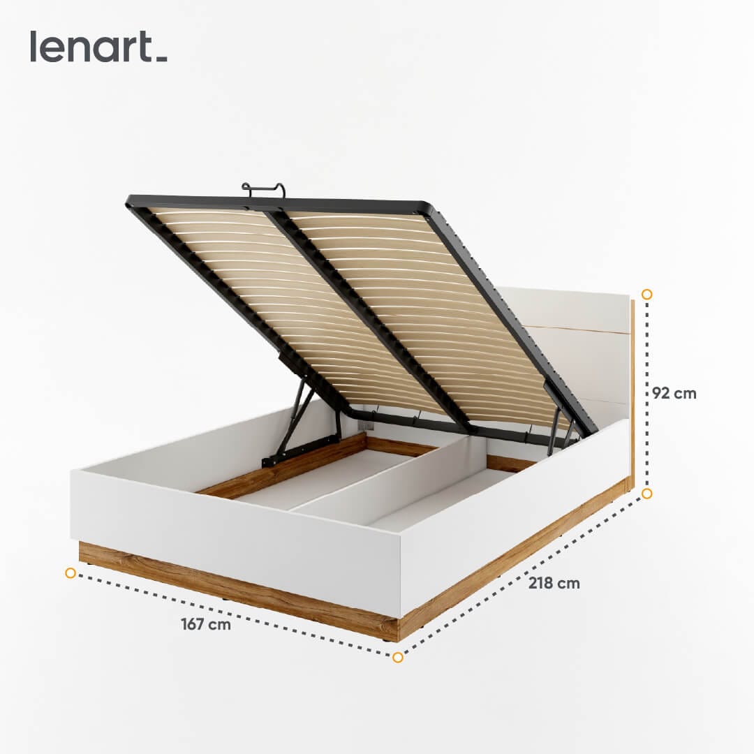 Wewnątrz łóżka zaprojektowano ogromny pojemnik – można w nim schować nie tylko pościel, ale także wszystko, co nie zmieściło się w szafie – walizki podróżne, sezonową odzież, akcesoria sportowe. Zastosowanie specjalnego mechanizmu z gazowymi podnośnikami sprawia, że podniesienie ramy jest lekkie i bezproblemowe.