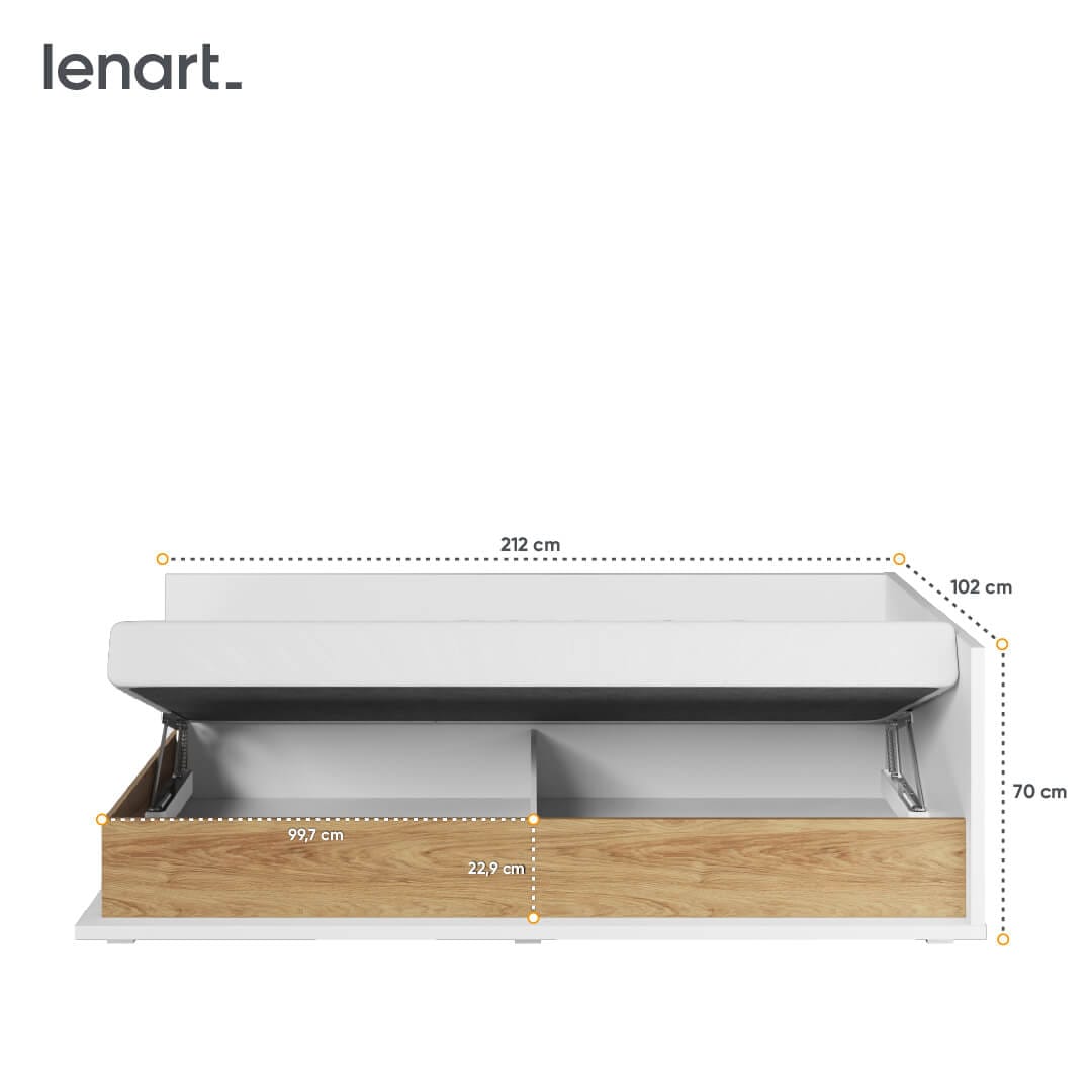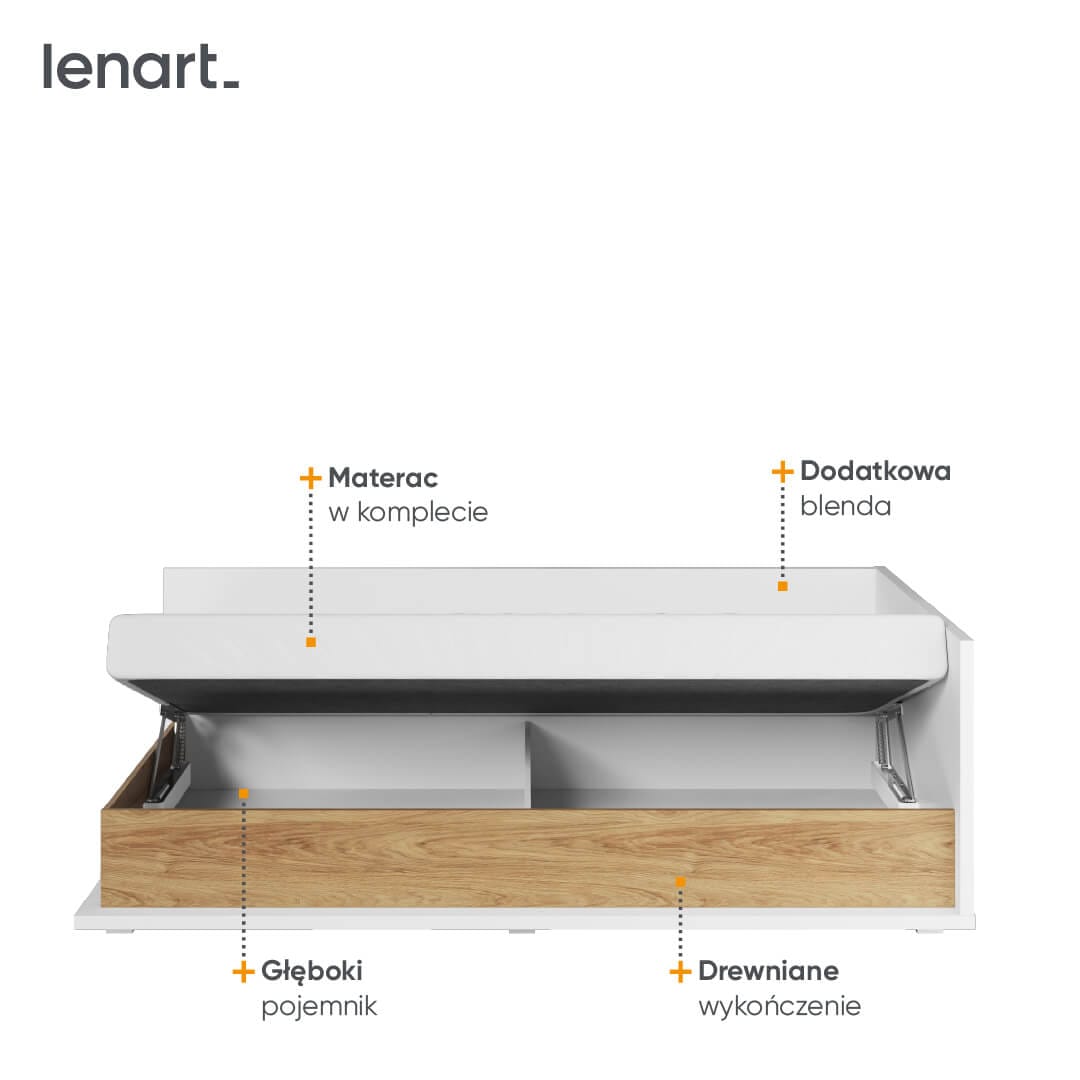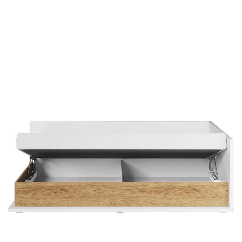 Wygodne i praktyczne łóżko jednoosobowe w nowoczesnym stylu. Ponadczasowe połączenie bieli i dekoru o ciepłym kolorze drewna sprawia, że łóżko stworzy przytulną aranżację w każdym pomieszczeniu.