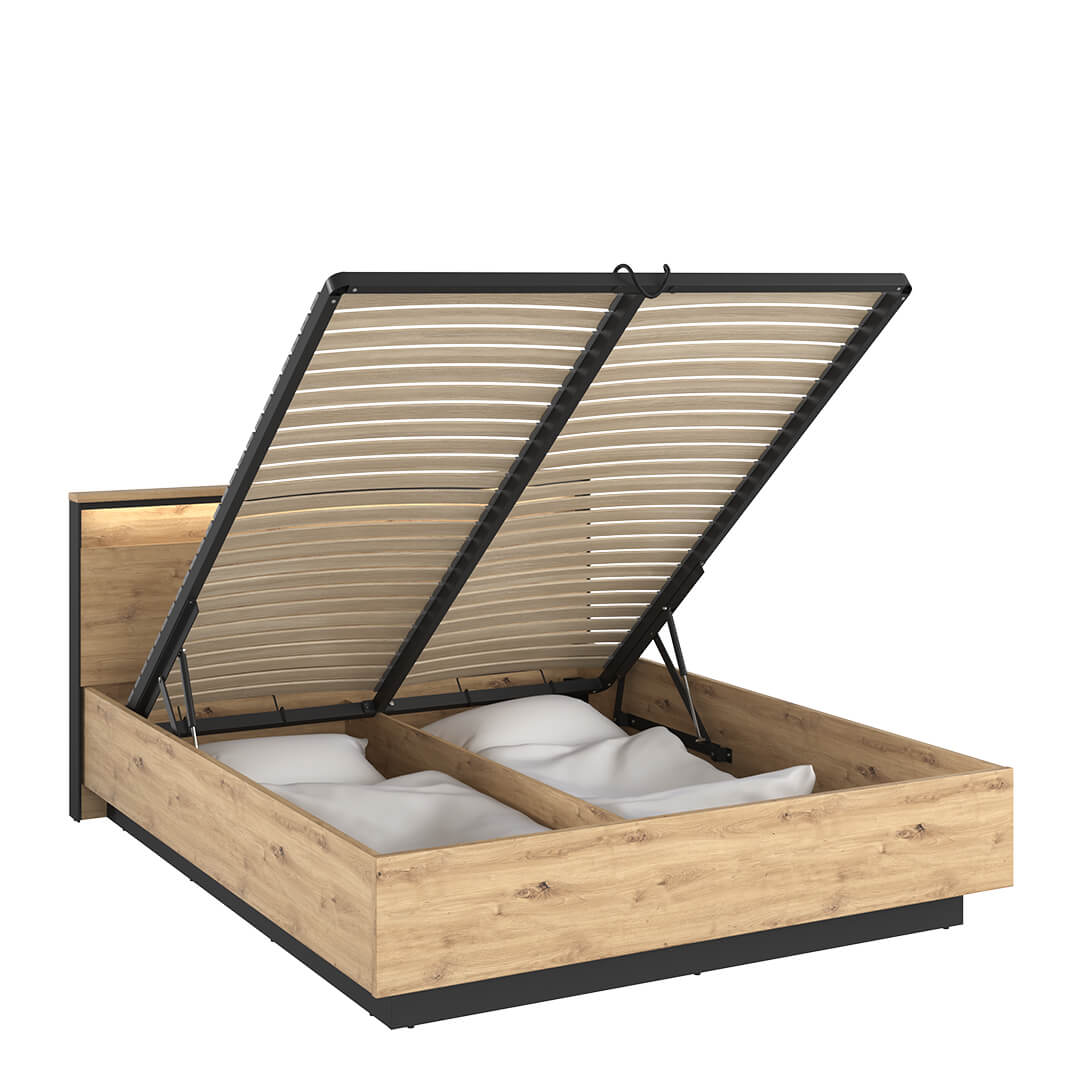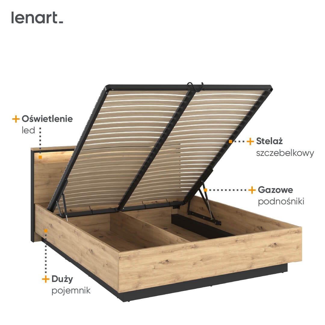 Łóżko zostało zaprojektowane w trosce o najwyższą jakość wypoczynku użytkowników. Posiada stelaż szczebelkowy, który dba o prawidłowe ułożenie materaca. Dodatkowym atutem jest duży i przestronny pojemnik, w którym z powodzeniem przechowasz sezonową odzież, sprzęt sportowy, pościele, koce oraz różne inne niezbędne rzeczy. Za łatwe i lekkie otwieranie ramy z materacem odpowiadają podnośniki gazowe. Nowoczesny design mebla podkreśla oświetlenie ledowe, które dzięki umieszczeniu w zagłówku może poniekąd pełnić funkcję lampki nocnej, jednak przede wszystkim wprowadza do wnętrza klimatyczny nastrój.