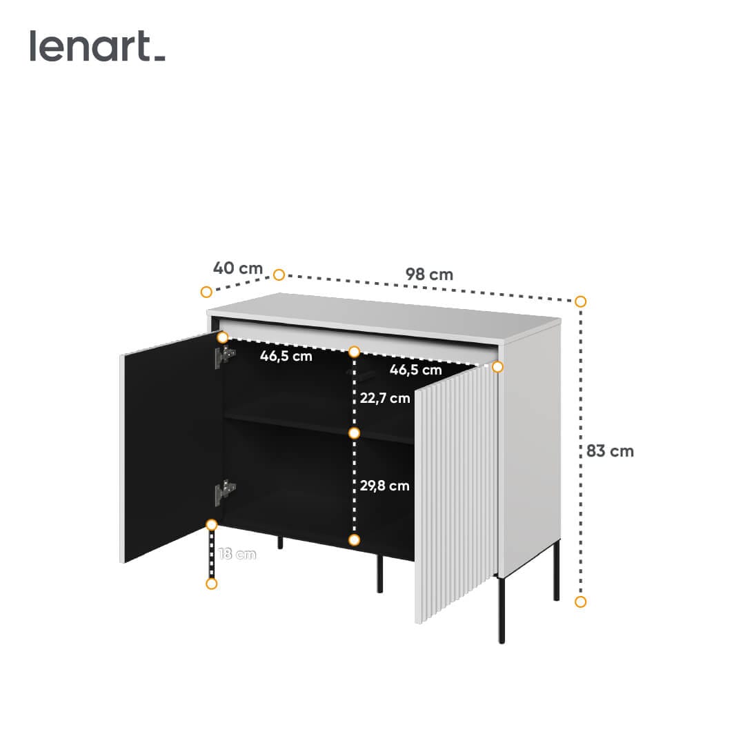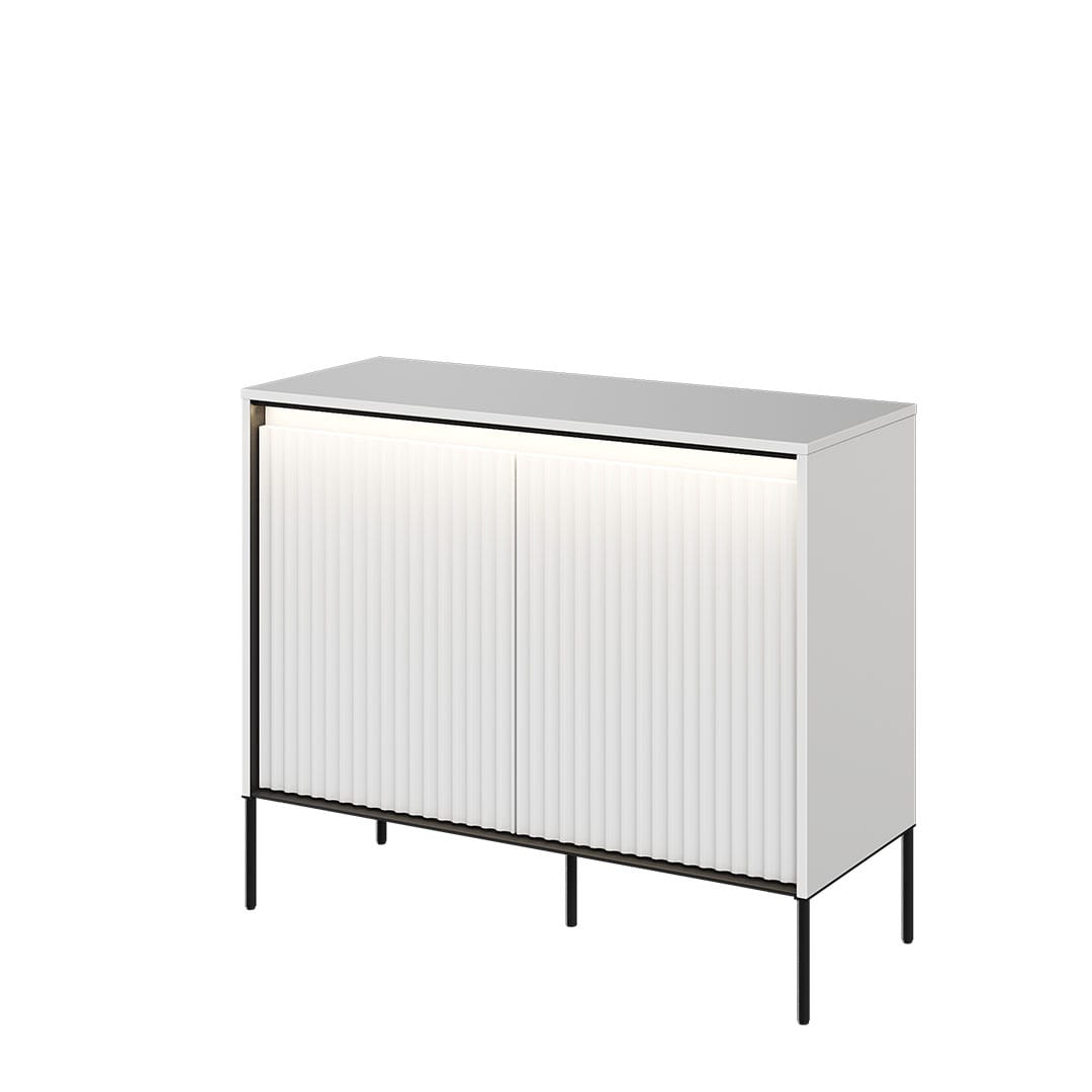 Wyjątkowym elementem tej komody są ryflowane fronty, które dodają jej niepowtarzalnego uroku i charakteru. Ryfle nadają meblowi elegancji i wyjątkowości, wyróżniając go spośród innych mebli na rynku. To idealny wybór dla tych, którzy cenią sobie oryginalny design i chcą dodać nieco tekstury i stylu do swojej przestrzeni. Mała komoda biała wspiera się kontrastowych czarnych, metalowych nóżkach, a całość dopełnia subtelne podświetlenie frontów w postaci paska ledowego.