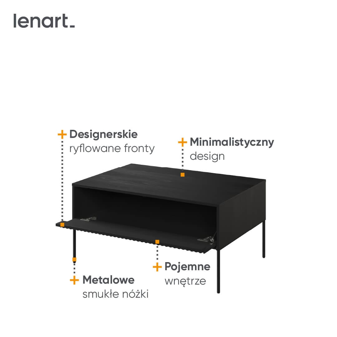 Wykonany z najwyższej jakości materiałów, stolik do salonu jest nie tylko estetyczny, ale również trwały i solidny. Funkcjonalność to kluczowy aspekt naszego modnego stolika do salonu. Posiada on ukrytą półkę, która umożliwia przechowywanie różnych przedmiotów, takich jak piloty, książki czy czasopisma. Dzięki temu utrzymasz porządek w swoim salonie, jednocześnie mając wszystko pod ręką.