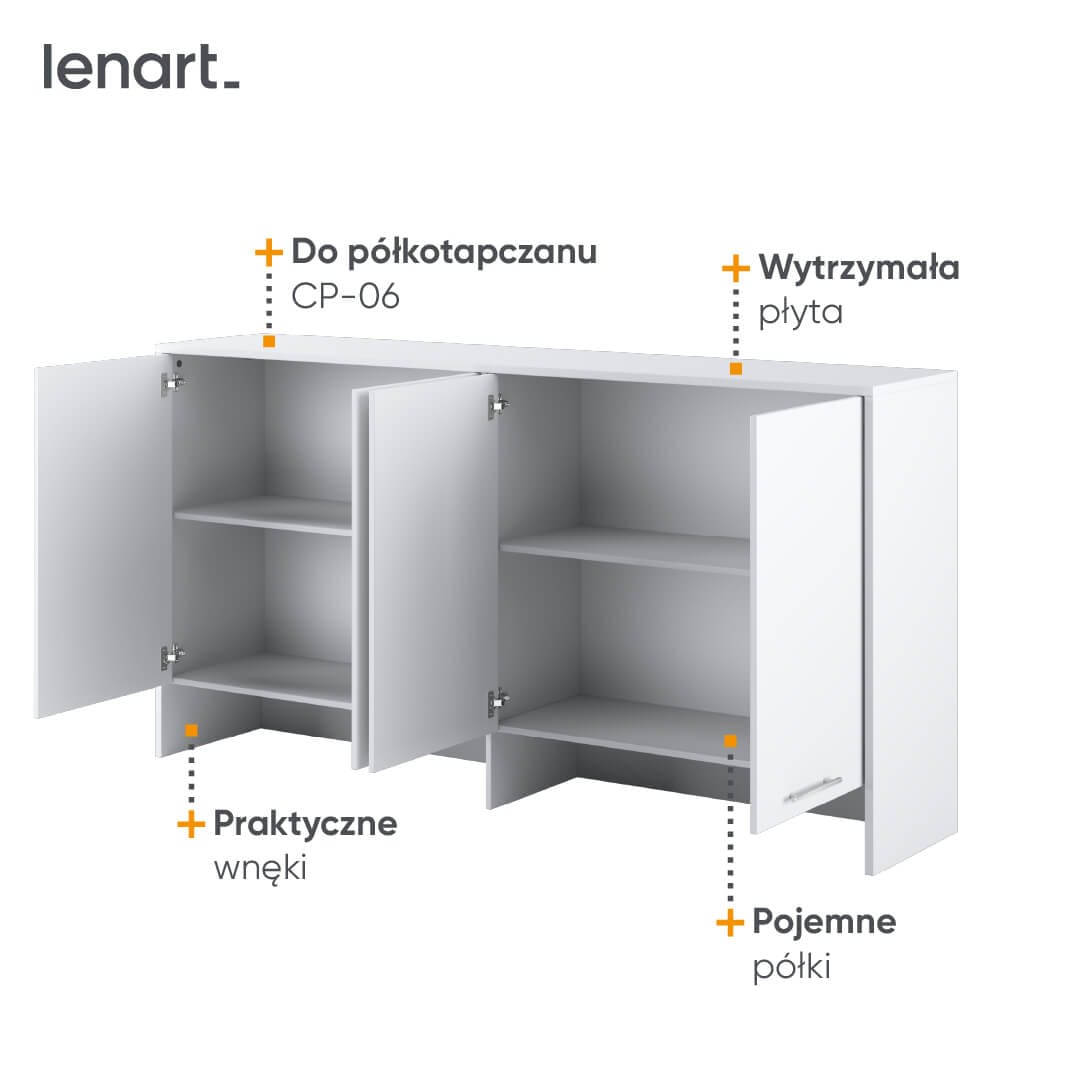 Funkcjonalna, wisząca nadstawka z czworgiem drzwi do skompletowania z półkotapczanem CP-06. W pojemnej szafce i otwartych wnękach przechowamy sporą ilość rzeczy. Nadstawka wraz z półkotapczanem stworzy ciekawą, nowoczesną zabudowę, wykorzystującą powierzchnię ściany, oszczędzającą przestrzeń we wnętrzu.
