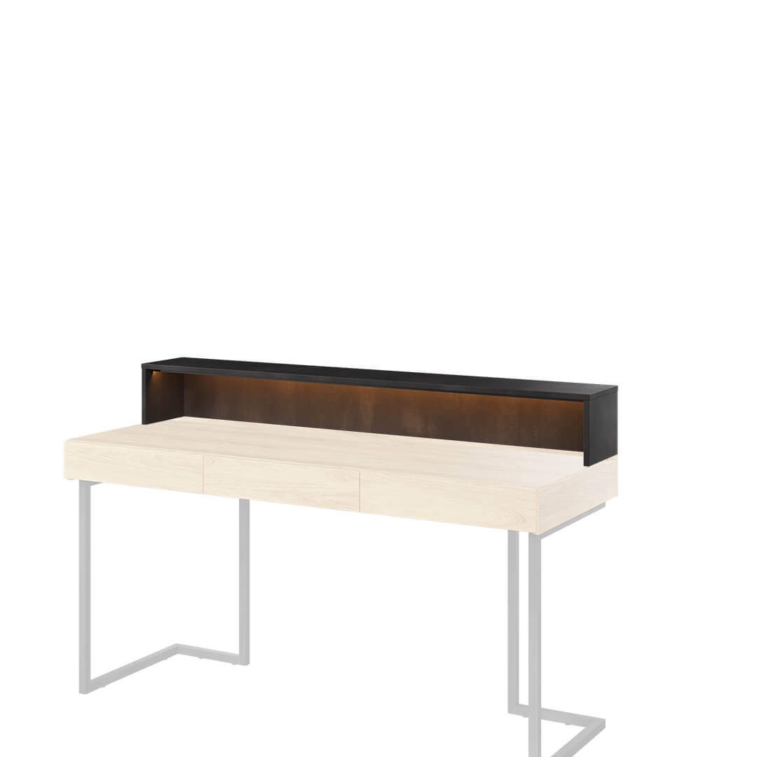 Designerska nadstawka nad biurko FE-04L/P. Doskonale sprawdzi się by wyeksponować na jej blacie monitor, dodatkową lampkę lub ulubione dekoracje. Została wyposażona w modne oświetlenie ledowe o energetyzującej barwie, które podkreśla nowoczesny charakter mebli.