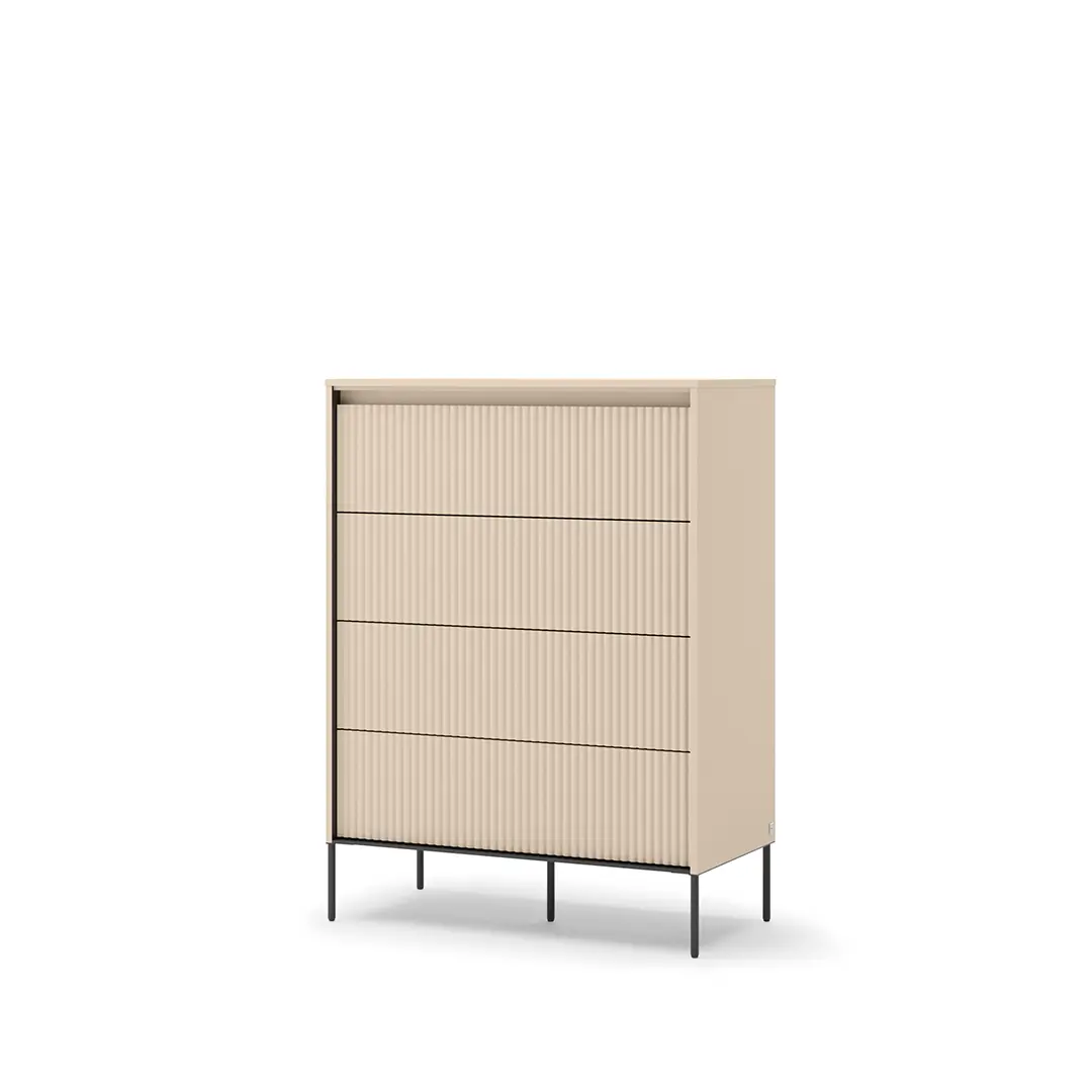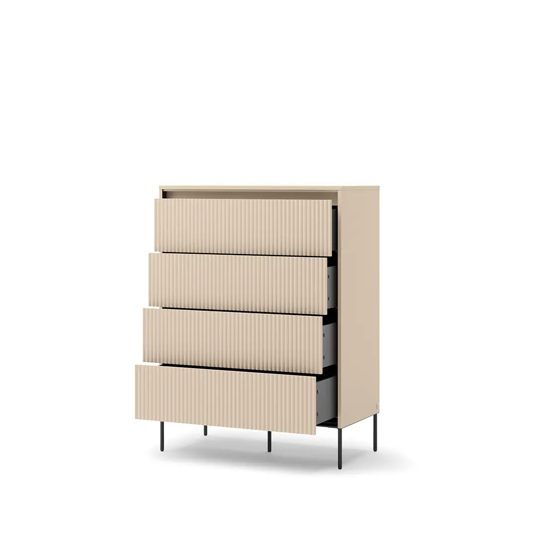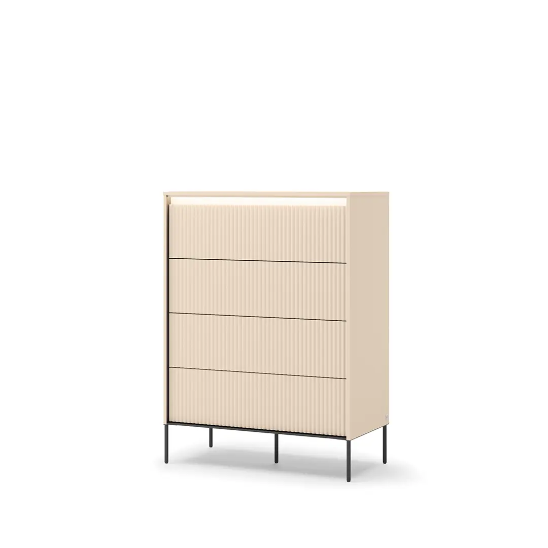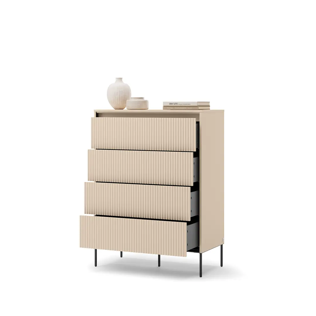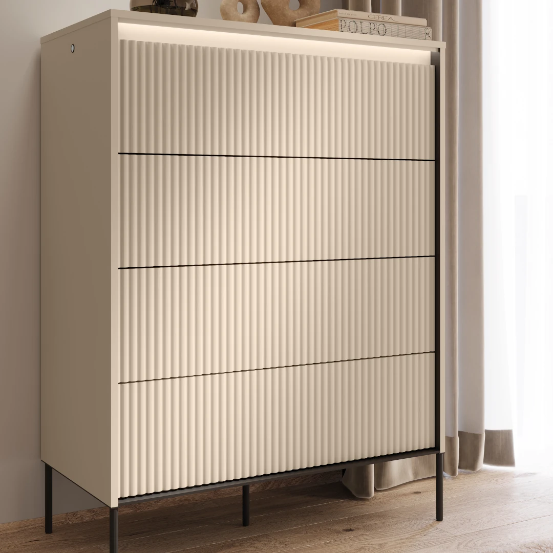 Nowoczesna niska komoda wyróżnia się minimalistycznym stylem i eleganckim wykończeniem, które doskonale wpasuje się w różnorodne aranżacje sypialni. Jej kompaktowe wymiary sprawiają, że idealnie nadaje się do ustawienia pod oknem lub wzdłuż ściany, nie przytłaczając przestrzeni.
