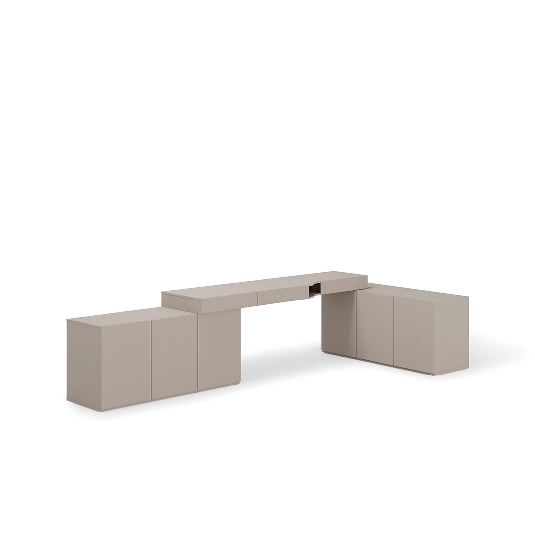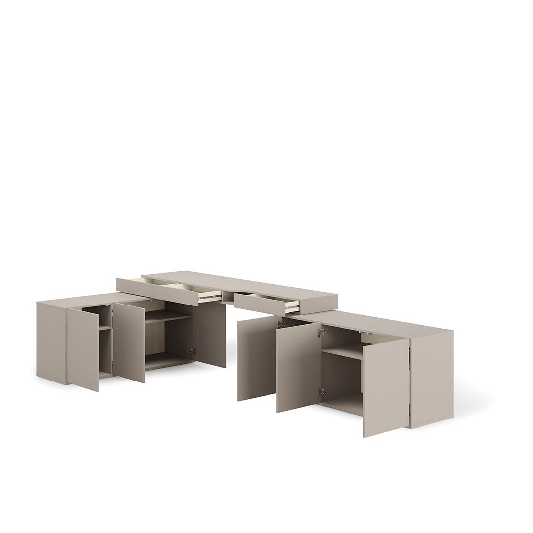 Zestawy młodzieżowe zawierają ergonomiczne biurko z szufladami ułatwiające organizację materiałów do nauki. Meble modułowe można dowolnie konfigurować, dostosowując je do indywidualnych potrzeb i metrażu pokoju.