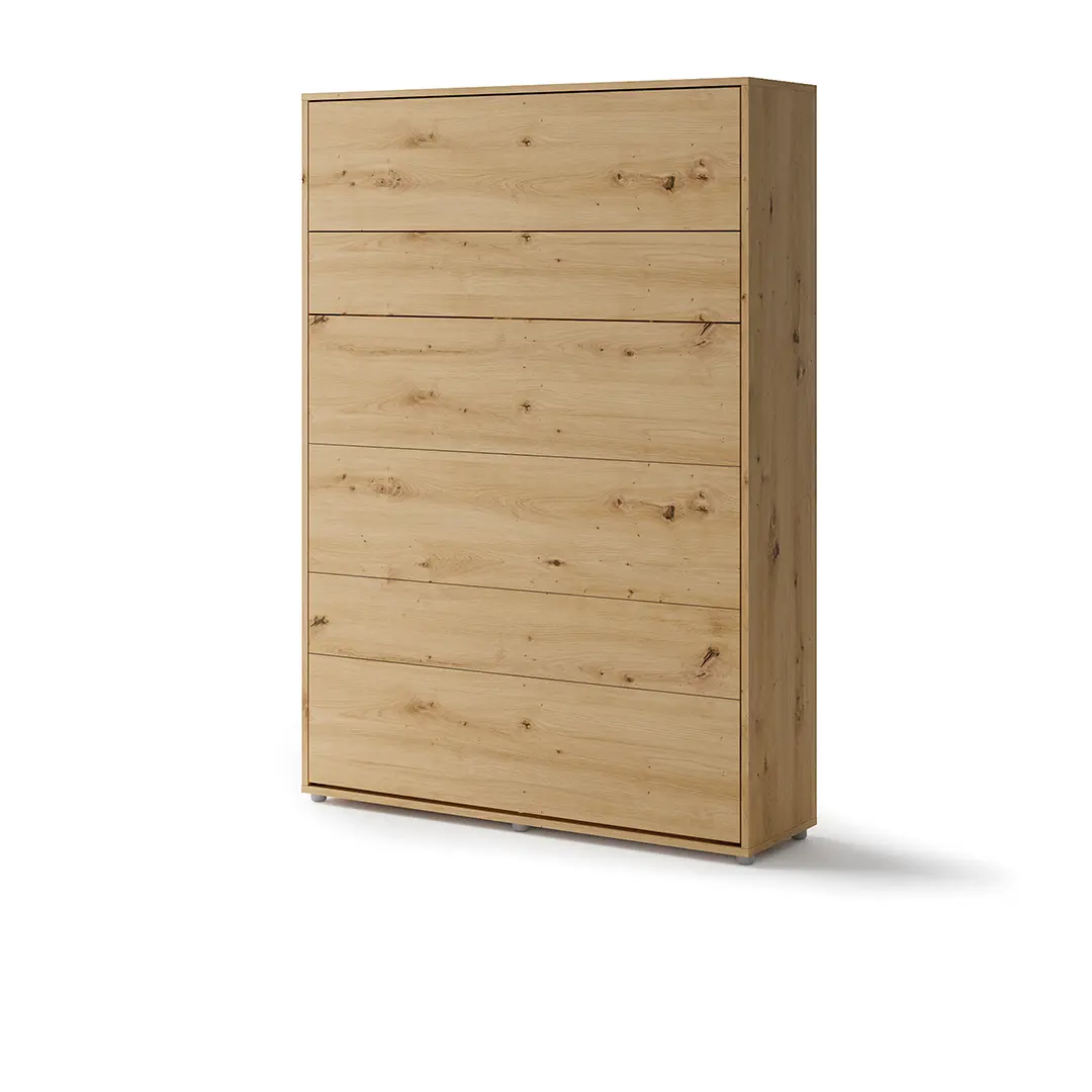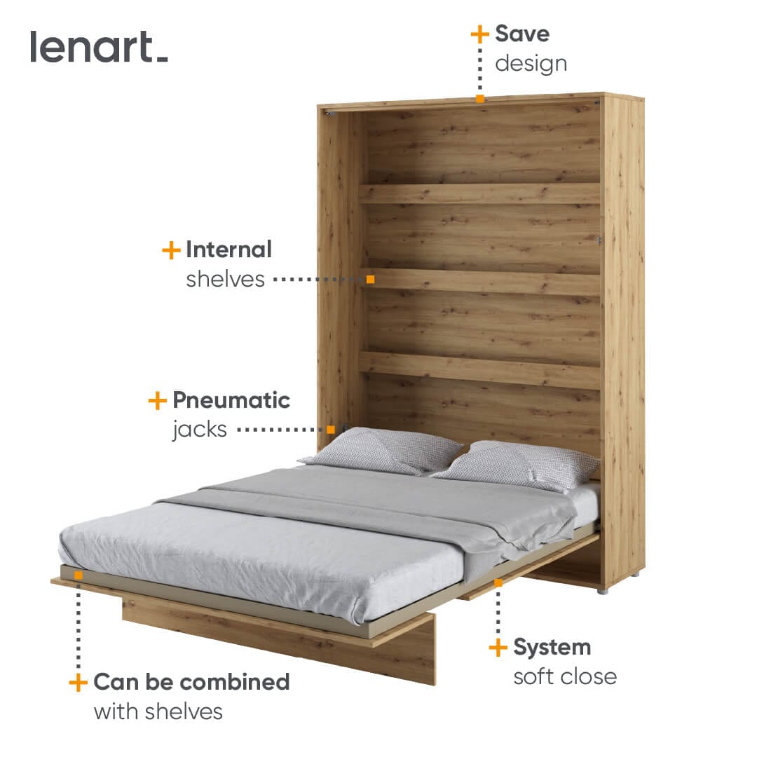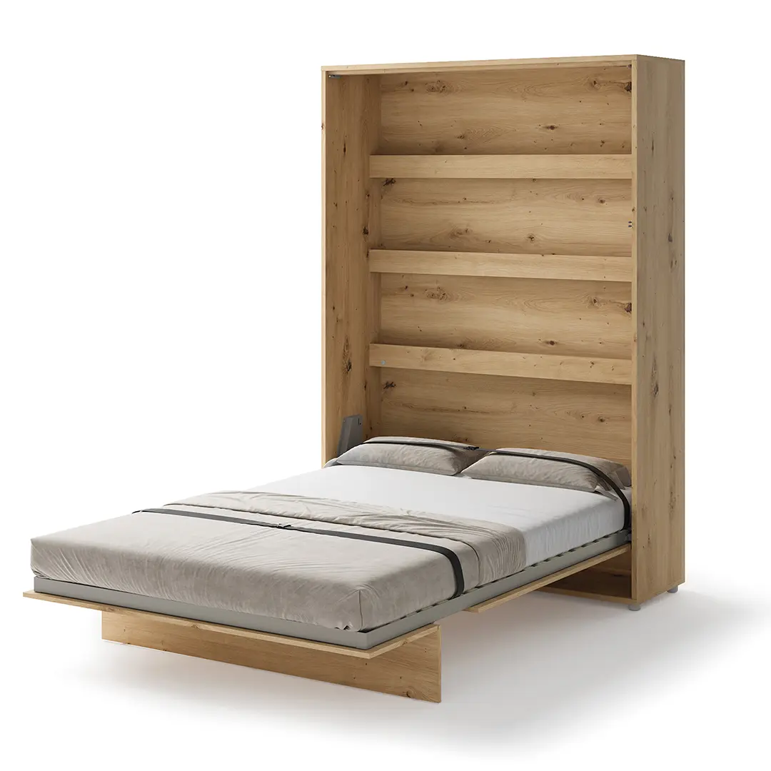 Wall bed in upright version for a 140 cm wide mattress. The unit is available in several colour versions. The bed features additional internal shelves, ideal for storing books and decorations or for putting away everyday items such as your phone. This unit was awarded the Gold Medal 2019 of the Poznan International Fair.