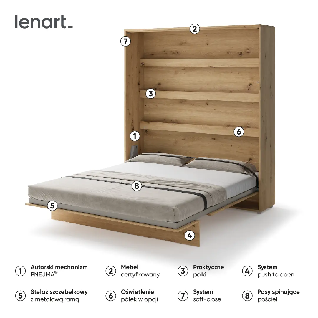 • Łóżko jest bezpieczne, stabilne i trwałe – posiada wzmocniony, montowany do ściany korpus, metalową ramę i wytrzymałą podporę zintegrowaną z frontem mebla. Pneumatyczne podnośniki zapobiegają gwałtownemu otwieraniu łózka.