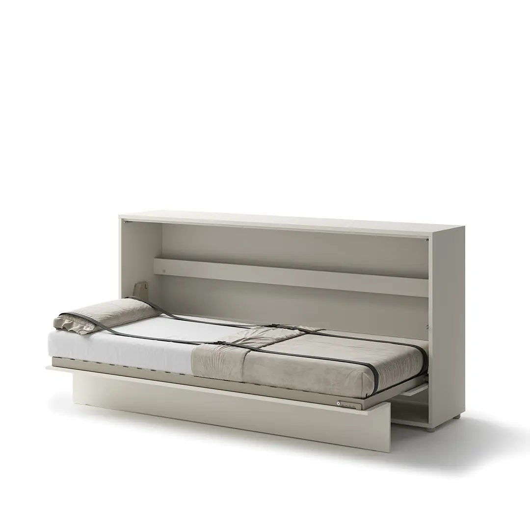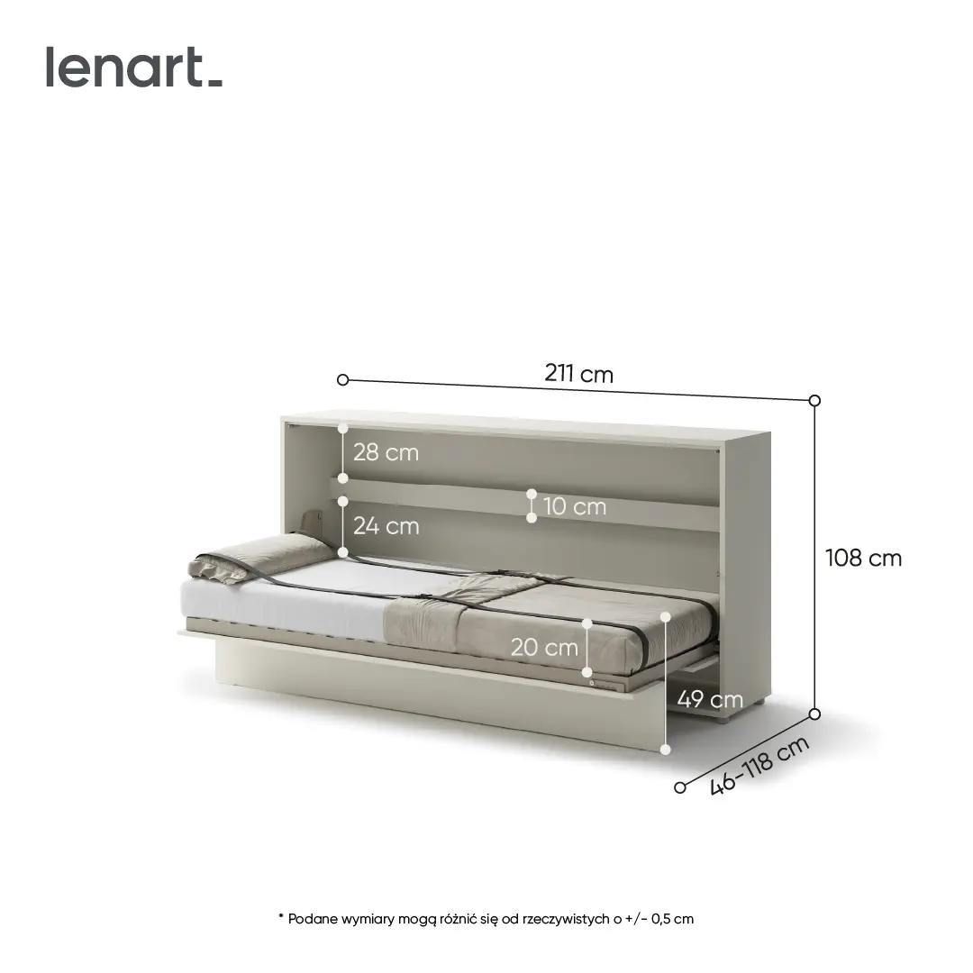 • Łóżko jest bezpieczne, stabilne i trwałe – posiada wzmocniony, montowany do ściany korpus, metalową ramę i wytrzymałą podporę zintegrowaną z frontem mebla. Pneumatyczne podnośniki zapobiegają gwałtownemu otwieraniu łózka.