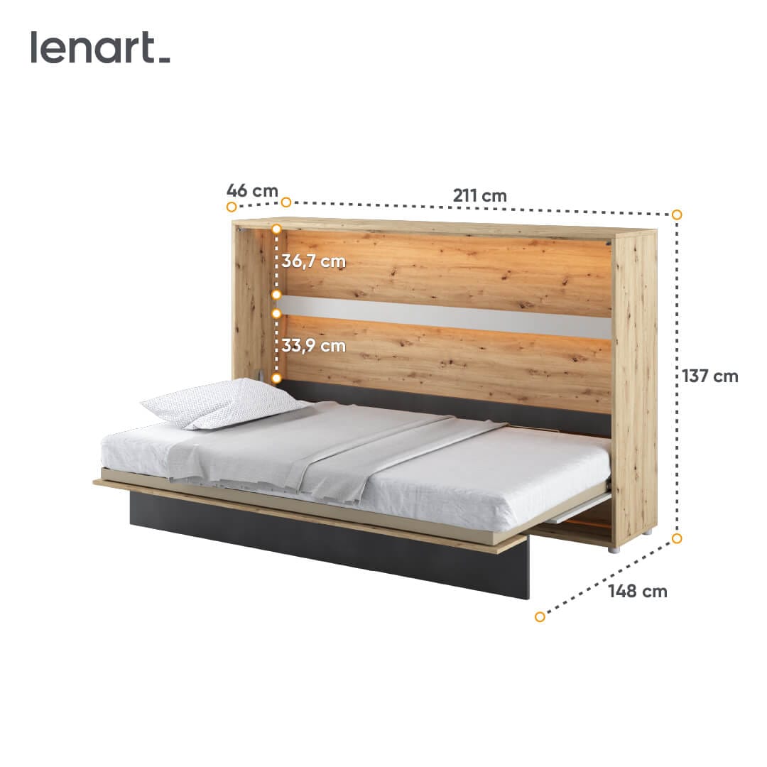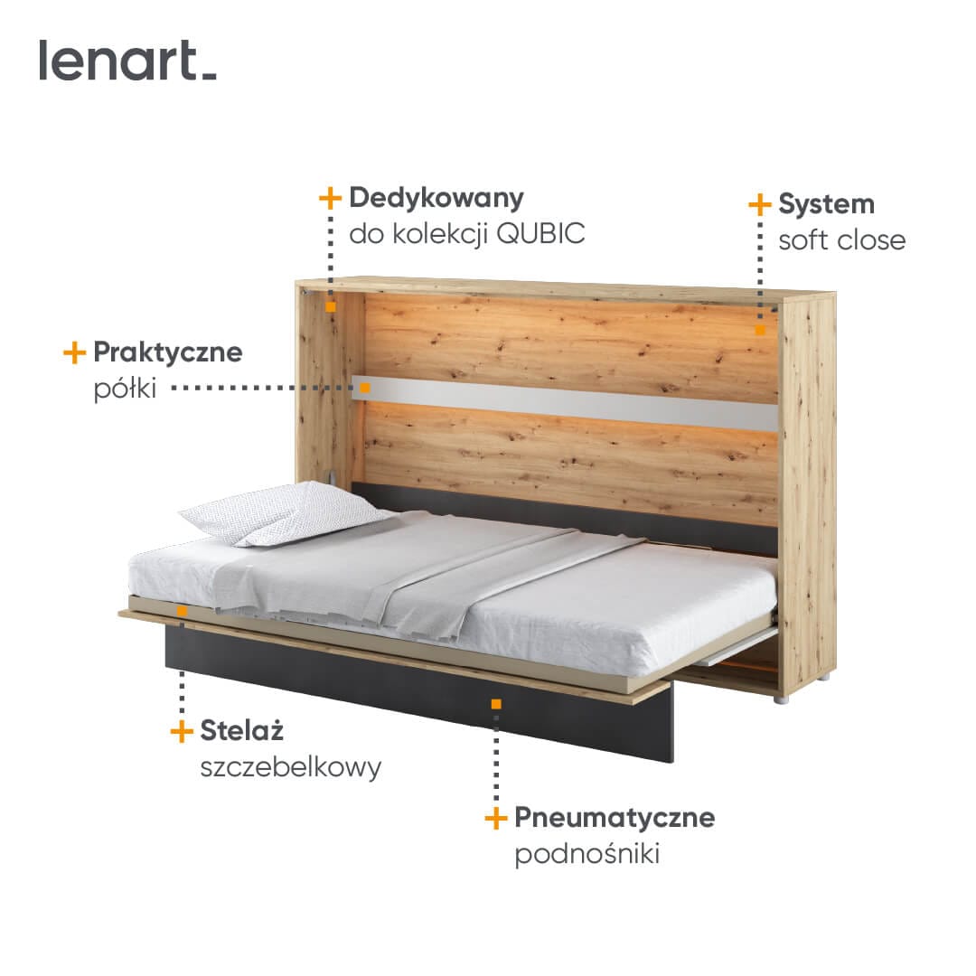 • Łóżko jest bezpieczne, stabilne i trwałe – posiada wzmocniony, montowany do ściany korpus, metalową ramę i wytrzymałą podporę zintegrowaną z frontem mebla. Pneumatyczne podnośniki zapobiegają gwałtownemu otwieraniu łózka.