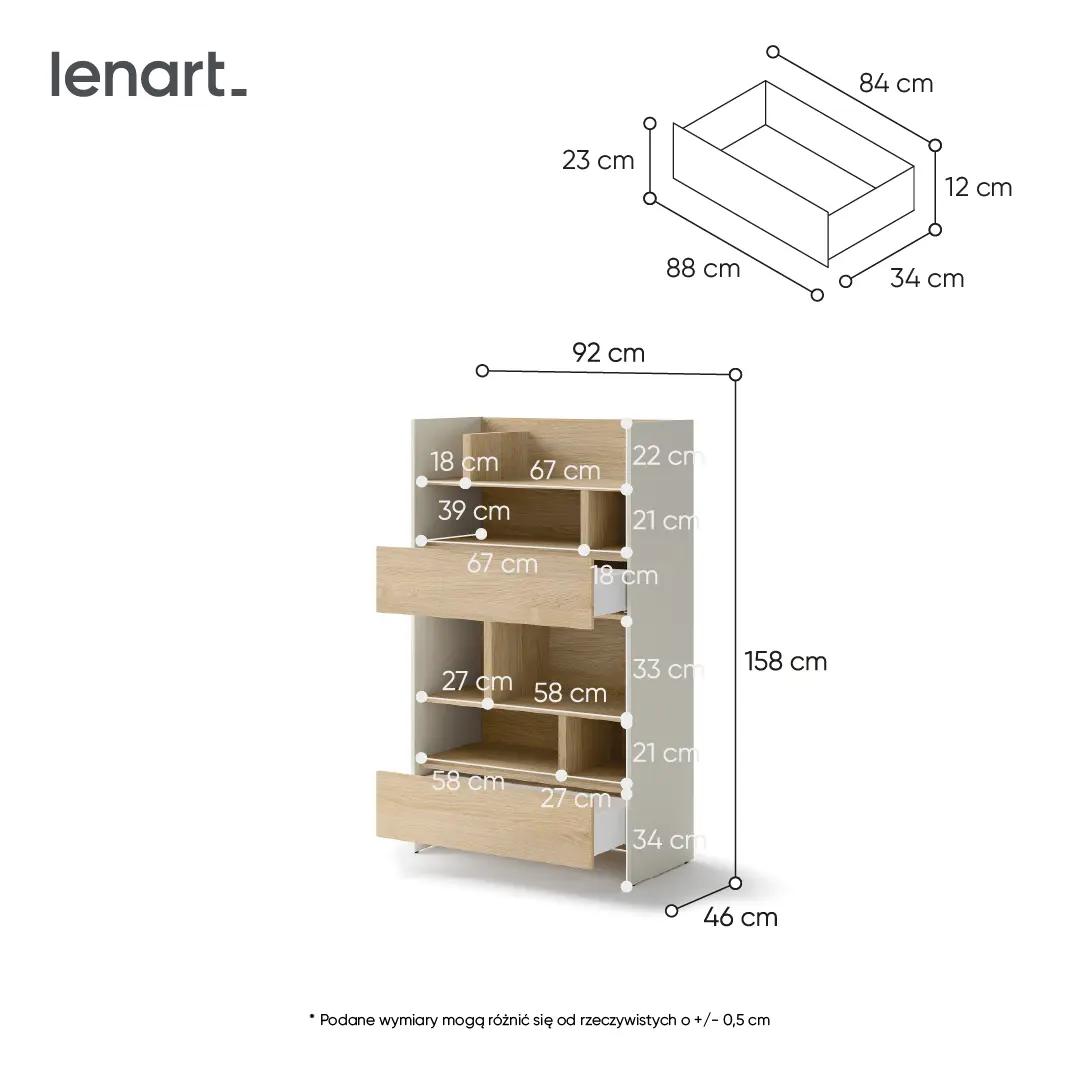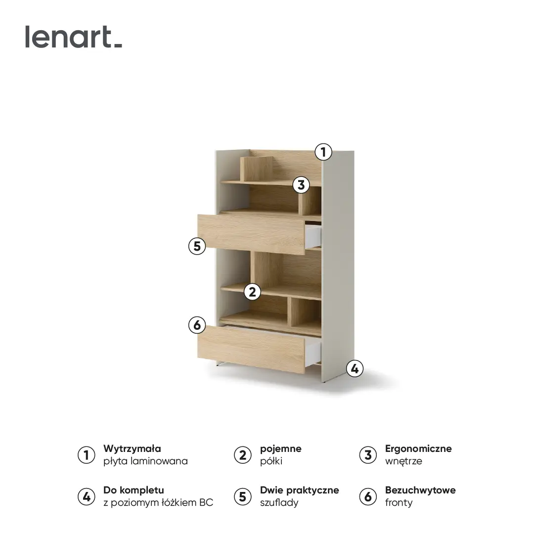 Regał BC-27 to funkcjonalny i elegancki element, który sprawdzi się w różnych wnętrzach, takich jak sypialnia, salon czy pokój dziecięcy. Jego przemyślany design umożliwia wygodne przechowywanie oraz eksponowanie najważniejszych przedmiotów. Wyposażony w półki z przegrodami i dwie przestronne szuflady, zapewnia odpowiednią przestrzeń na drobiazgi i akcesoria. Dostępny w różnych kolorach, pozwala na łatwe dopasowanie do aranżacji wnętrza. Nowoczesny wygląd regału w połączeniu z jego ponadczasowym stylem z pewnością uczyni Twoją przestrzeń bardziej funkcjonalną i przytulną. To doskonały wybór dla każdego, kto chce efektywnie zagospodarować miejsce w swoim domu.