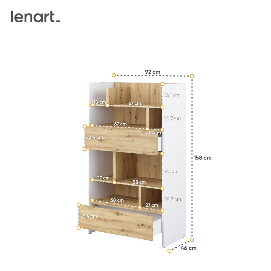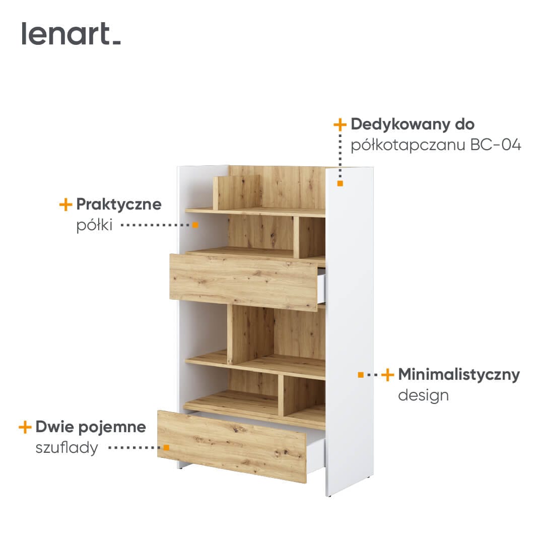Regał do półkotapczanu BC-04 to wyjątkowo praktyczny i stylowy element wyposażenia, który można wykorzystać w wielu pomieszczeniach domowych, w tym w sypialni, salonie czy pokoju dziecięcym. Dzięki swojemu funkcjonalnemu kształtowi pozwala na przechowywanie i wyeksponowanie najważniejszych rzeczy w pomieszczeniu. Został wyposażony w półki z przegrodami oraz dwie pojemne szuflady na wszelkie drobiazgi. Regał dostępny jest w różnych kolorach, co pozwala na swobodne dopasowanie go do każdego wnętrza. Nowoczesny design mebla w połączeniu z jego ponadczasowym stylem sprawi, że Twoja strefa relaksu stanie się jeszcze bardziej przytulna. Bez wątpienia, będzie to idealny dodatek dla każdego, kto chce w ciekawy sposób wykorzystać przestrzeń swojego domu.