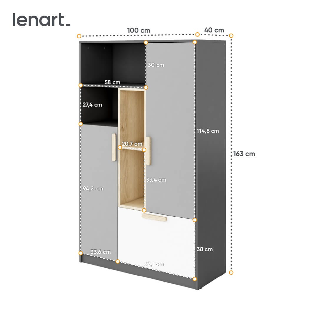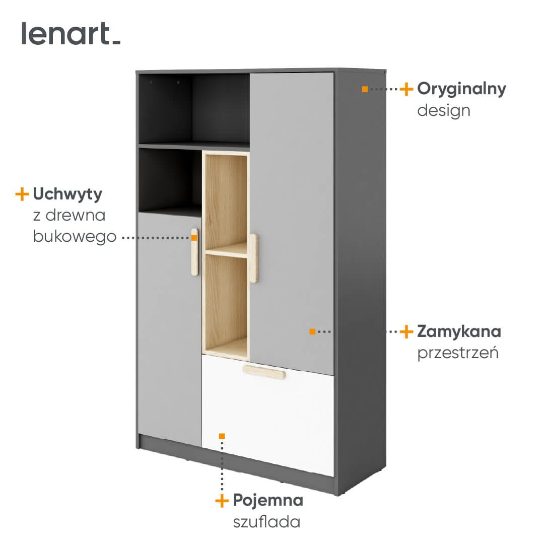 Bardzo oryginalny regał, który pozwala na wygodne rozmieszczenie najróżniejszych rzeczy. Posiada zamykaną przestrzeń do przechowywania odzieży i innych przedmiotów, których nie lubisz trzymać na wierzchu. Na dole znajduje się pojemna szuflada, np. na bieliznę lub inne drobiazgi. Grafitowe półki to dobre miejsce na książki lub szkolne akcesoria. W wysokich wnękach, zaakcentowanych dekorem w kolorze drewna, możesz umieścić teczki, segregatory, albumy lub wysokie książki.