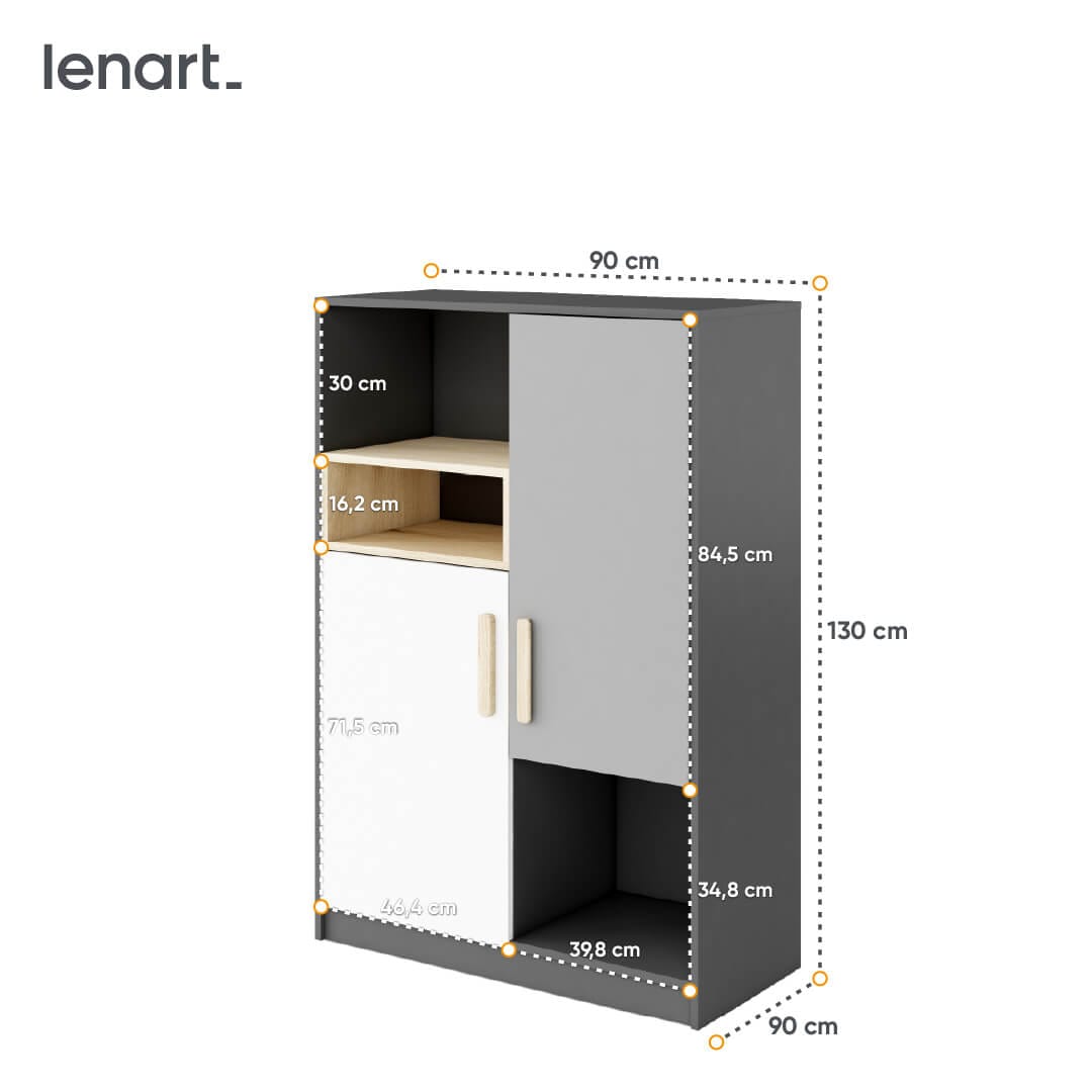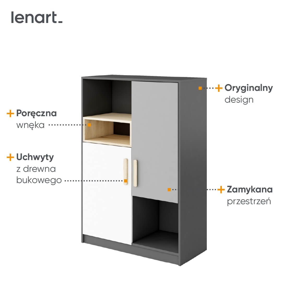 Bardzo oryginalny regał, który pozwala na wygodne rozmieszczenie najróżniejszych rzeczy. Posiada zamykaną przestrzeń do przechowywania odzieży i innych przedmiotów, których nie lubisz trzymać na wierzchu. Grafitowe półki to dobre miejsce na książki, również te wysokie typu atlasy i inne szkolne akcesoria. W niskiej wnęce, zaakcentowanej dekorem w kolorze drewna, możesz umieścić mniejsze rzeczy i dekoracje.