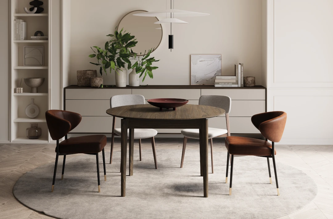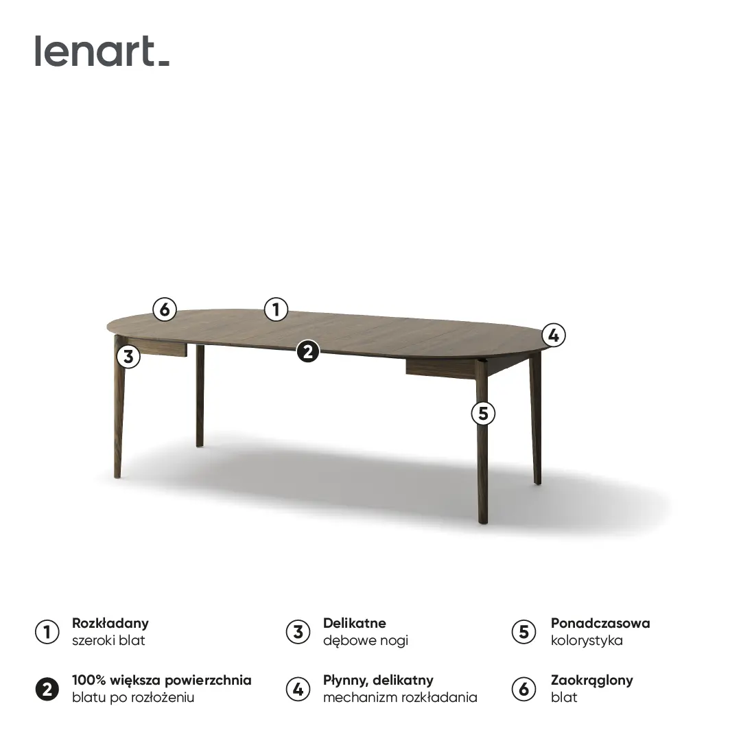 Stół rozkładany to rozwiązanie doskonałe zarówno do mniejszych, jak i większych pomieszczeń. Jego kompaktowy, okrągły kształt pozwala zaoszczędzić miejsce na co dzień, a możliwość rozłożenia daje elastyczność przy organizowaniu spotkań. W ten sposób nie musisz rezygnować z eleganckiego wyglądu nawet w niewielkich wnętrzach. Warto również podkreślić, że ciemny dąb pięknie komponuje się z innymi naturalnymi materiałami, takimi jak skóra, len czy metal, tworząc stylową aranżację.