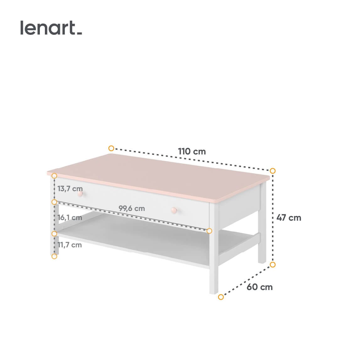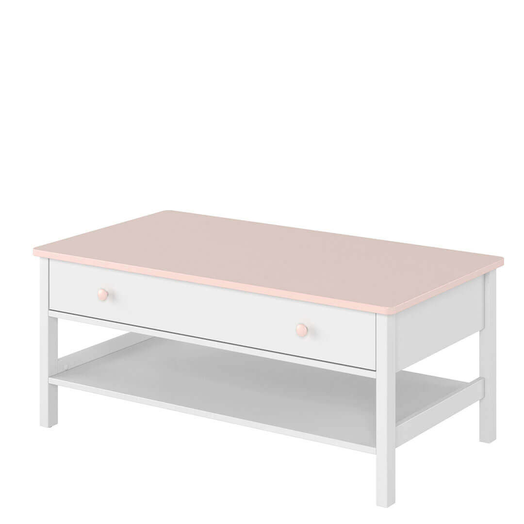 Subtelne połączenie bieli i pudrowego różu sprawia, że stolik spodoba się wielbicielkom bajek o księżniczkach w każdym wieku.
