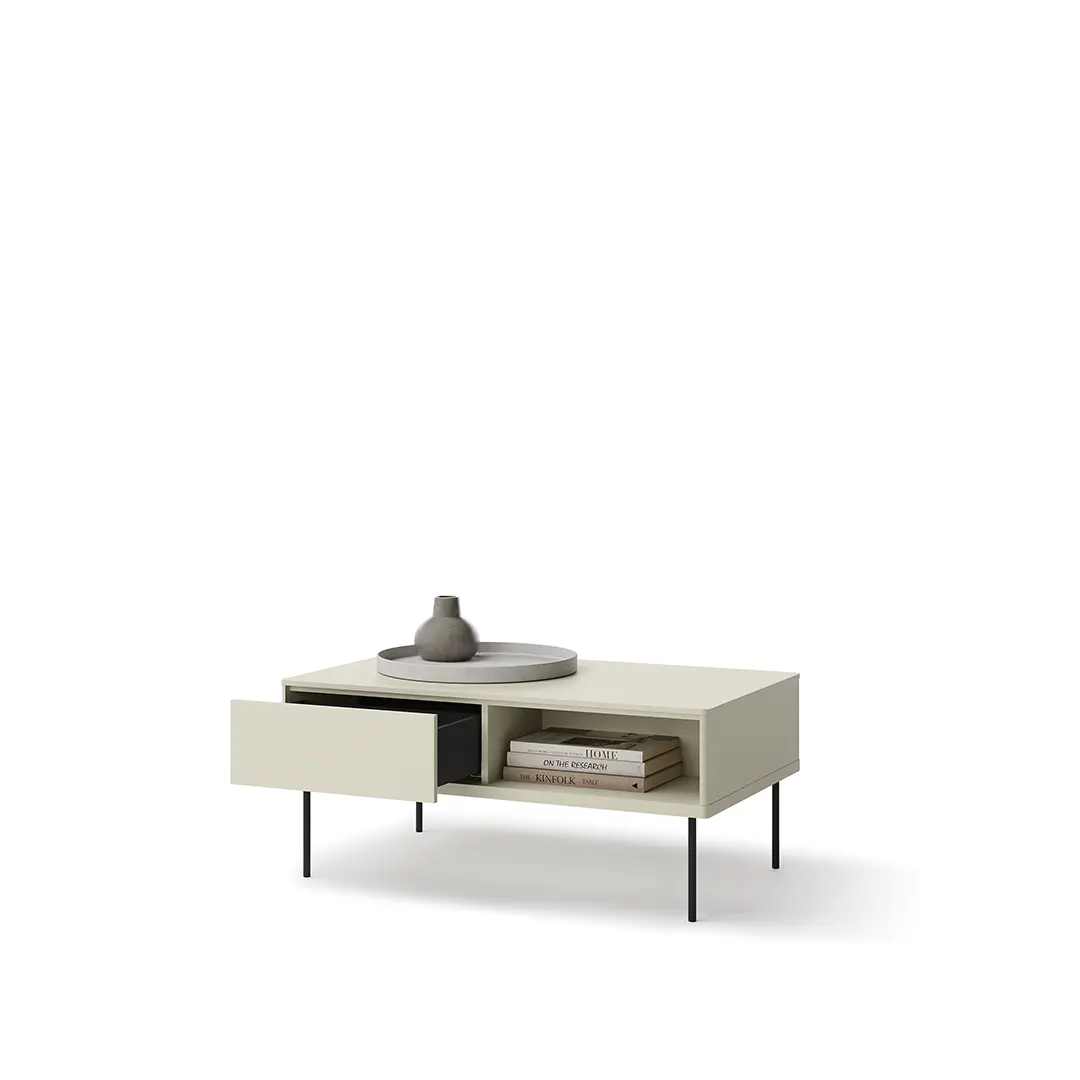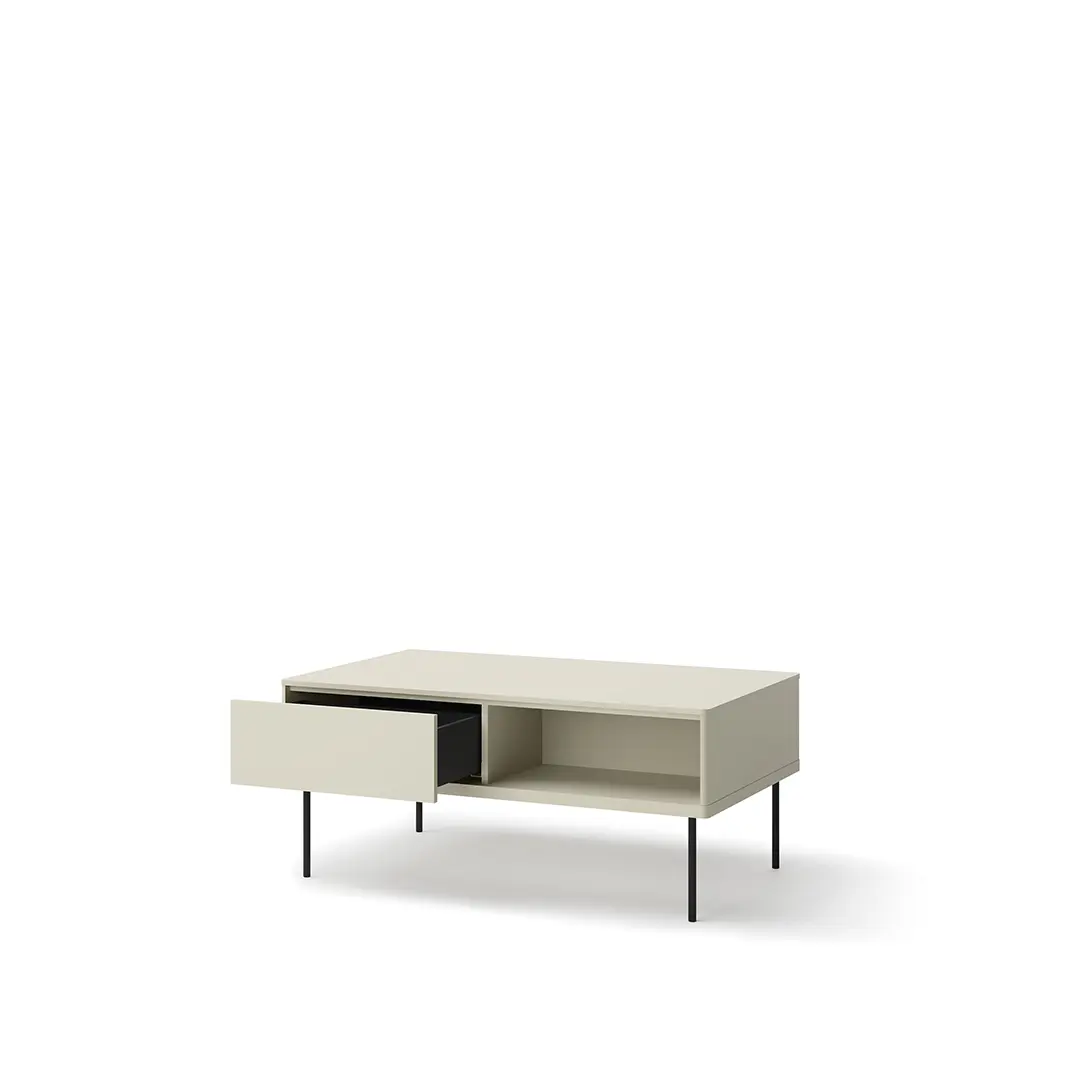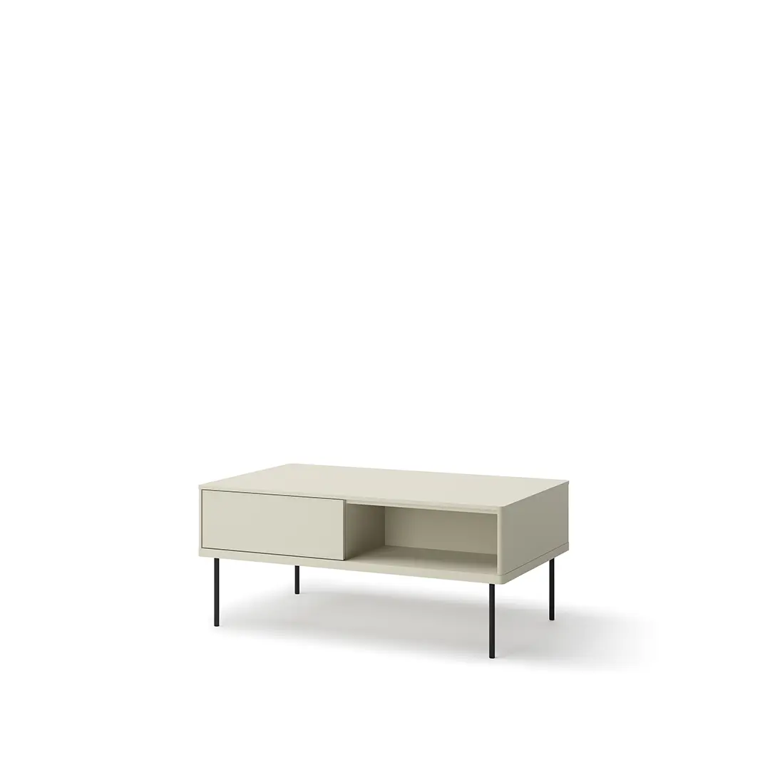 Ten prostokątny stół kawowy wyróżnia się swoim minimalistycznym designem, który idealnie wpisuje się w nowoczesne aranżacje. Dzięki wymiarom 110 x 48 x 67 cm oferuje wystarczająco dużo miejsca na filiżanki kawy, dekoracje czy ulubioną książkę, jednocześnie nie przytłaczając przestrzeni. Jego kształt sprawia, że świetnie komponuje się z sofami i narożnikami, tworząc harmonijną strefę relaksu w Twoim domu.