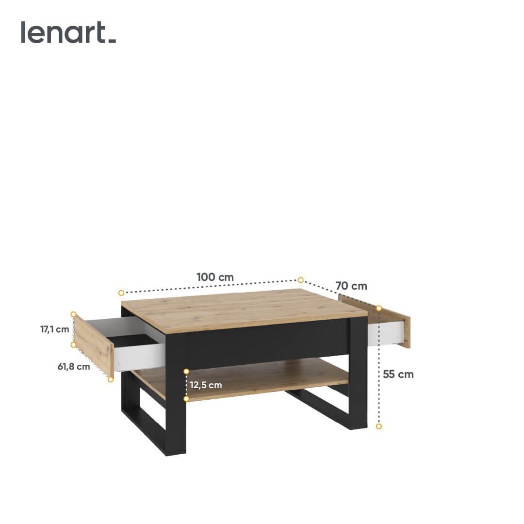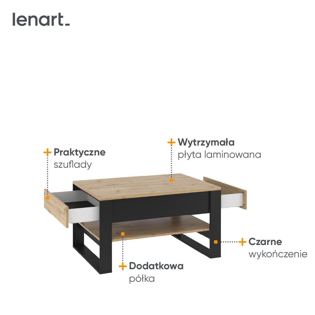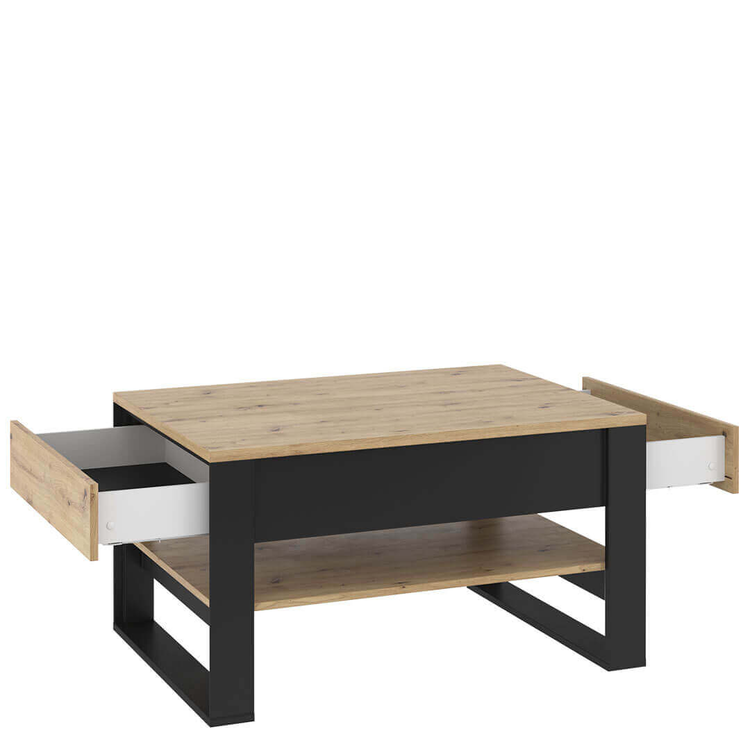 Elegancki stolik kawowy z półką oraz dwiema bardzo praktycznymi szufladami. Schowasz w nich piloty, czytane aktualnie gazety oraz dziecięce drobiazgi, które wciąż nie mogą trafić na swoje miejsce. Od teraz na blacie stolika zawsze będzie miejsce na filiżankę z kawą.